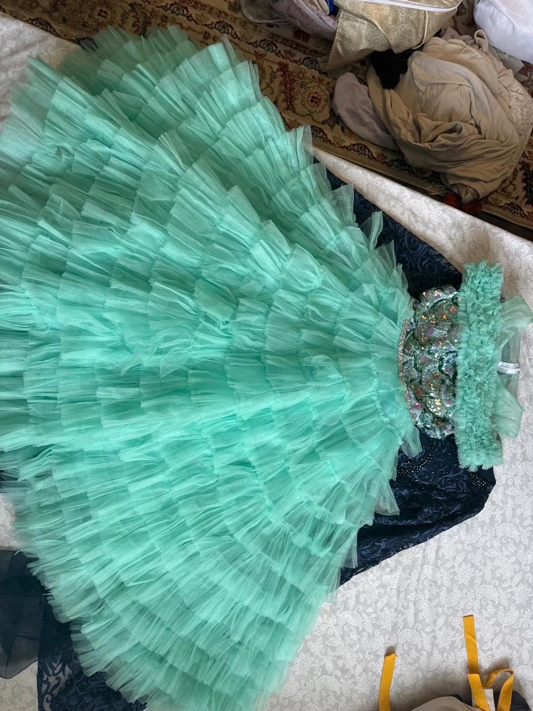 Selling a pretty mint green dress with ruffled layers and a sequined bodice! It's in great condition and would be perfect for a special occasion.