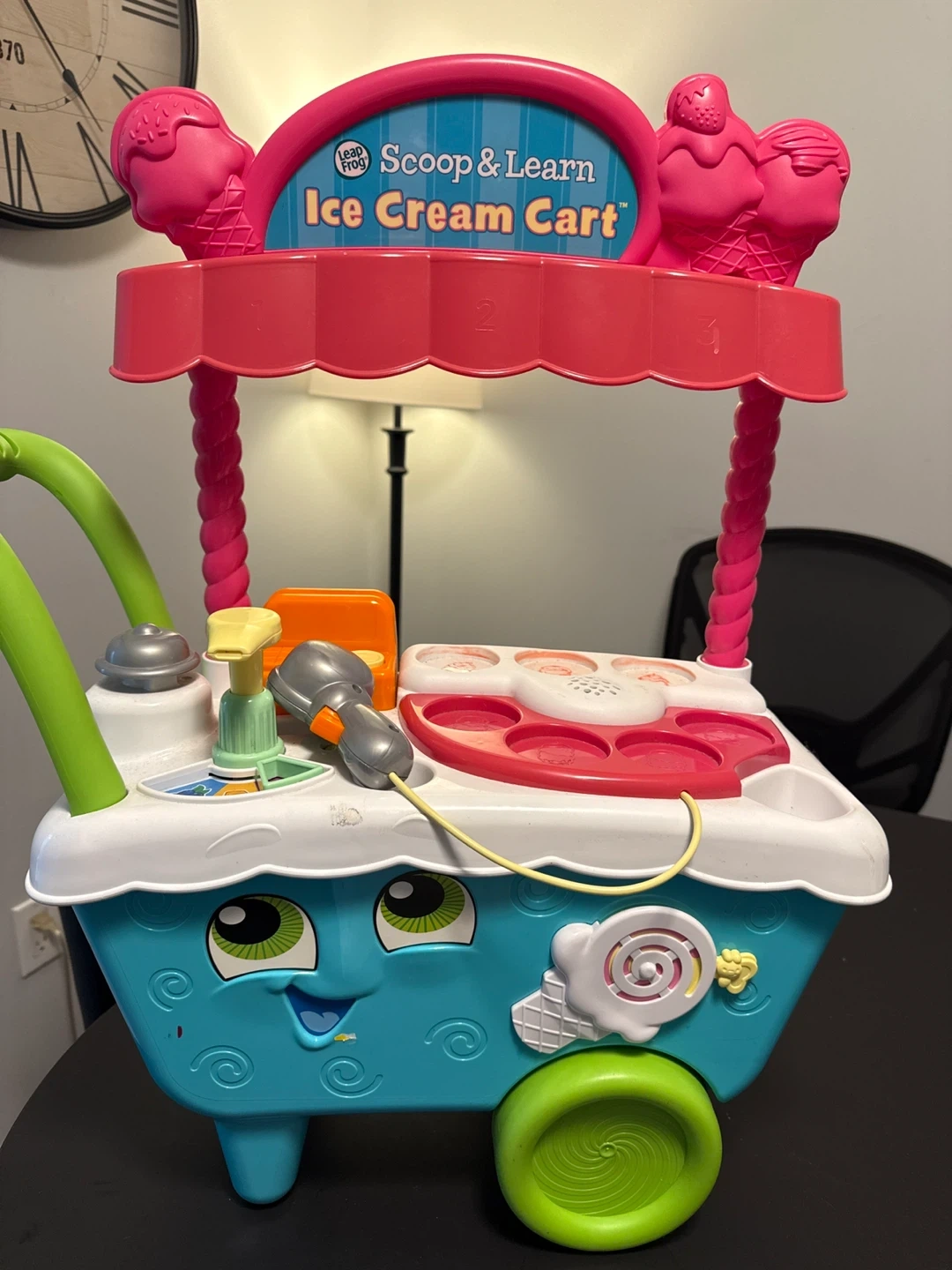 I'm selling a gently used LeapFrog Scoop & Learn Ice Cream Cart! It's a fun and interactive toy for kids. This cart helps children learn about numbers, colors, and flavors while encouraging imaginative play. It's in great condition and ready for a new home!