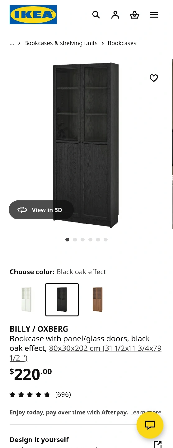 Selling an IKEA Billy / Oxberg bookcase in black oak effect! It's a great piece for displaying your books and other items. The dimensions are 80x30x202 cm (31 1/2x11 3/4x79 1/2 ")