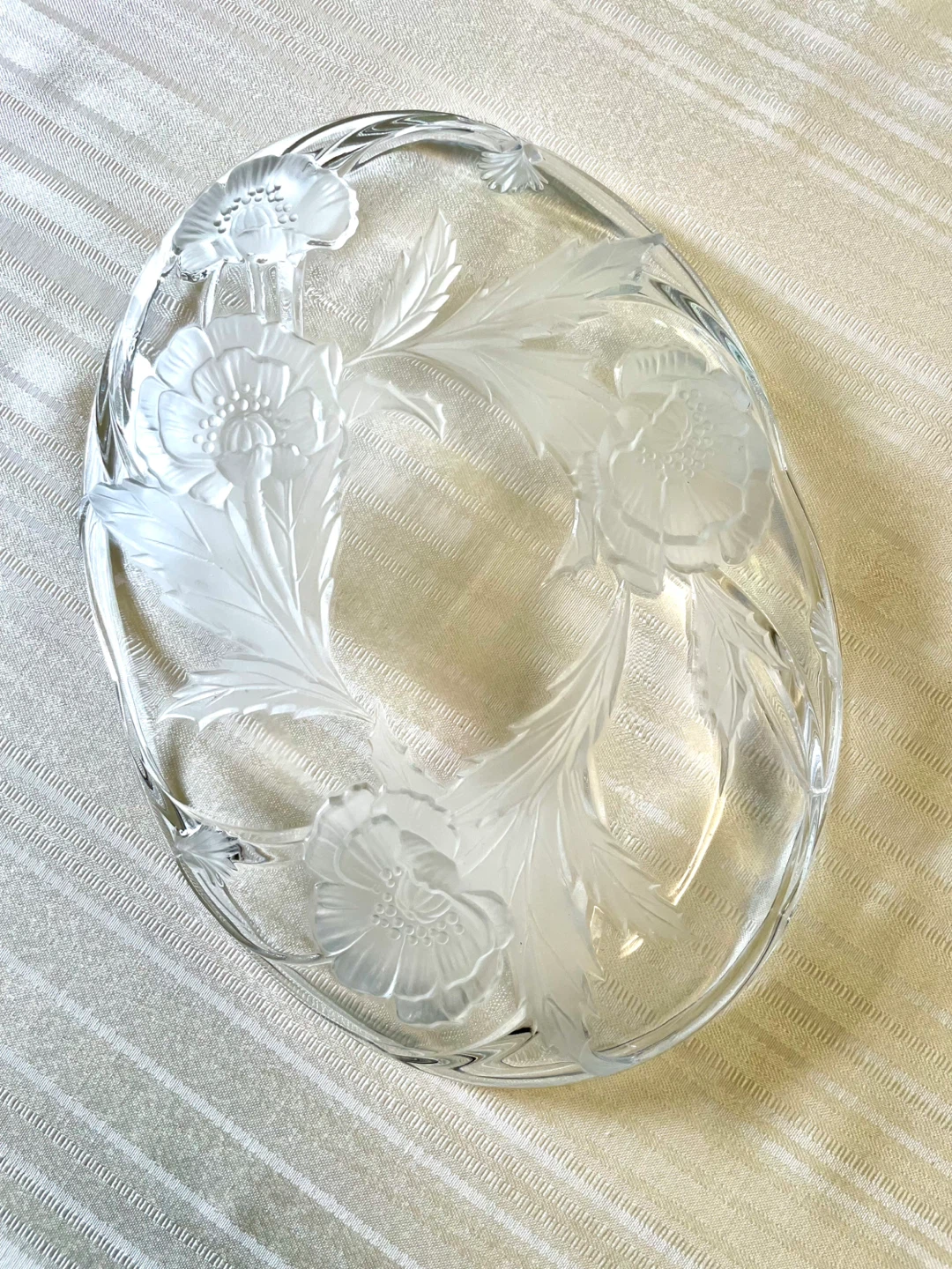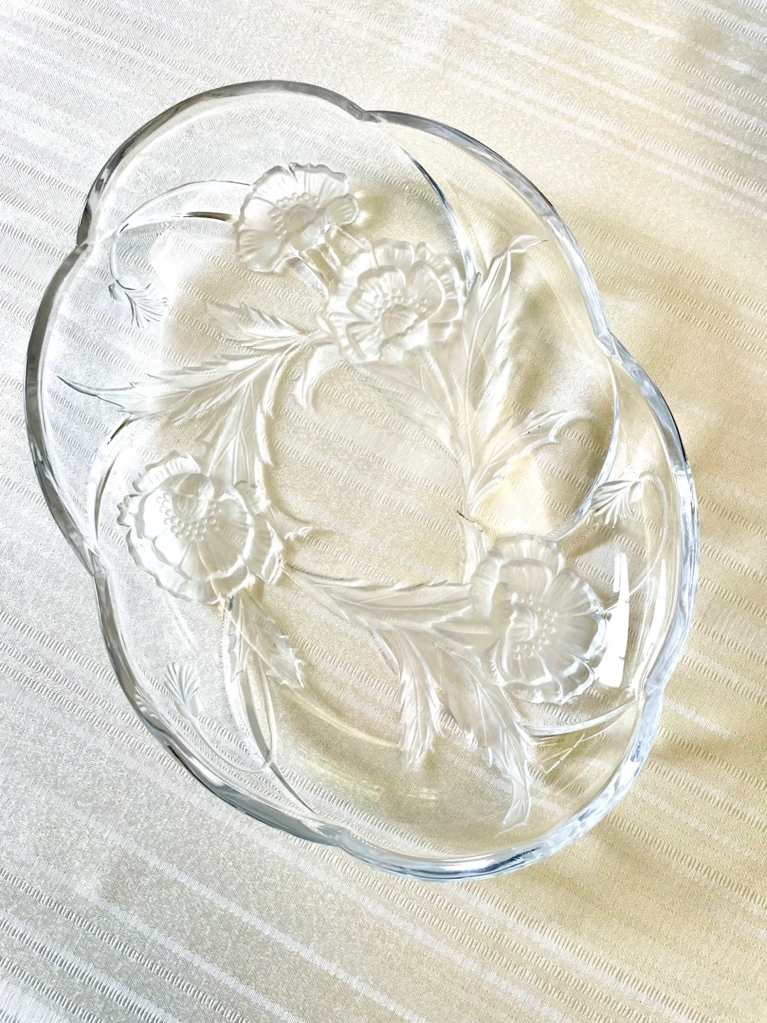 Selling a vintage clear glass oval platter from the Mikasa Studio Nova Walther Collection made in Germany. It features a raised floral and leaf relief. Measures 11 1/2” x 8.25”. Excellent condition.