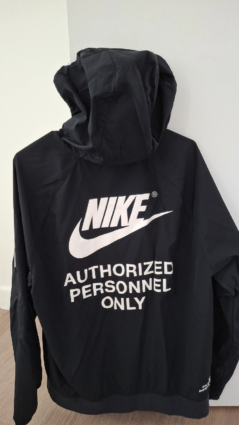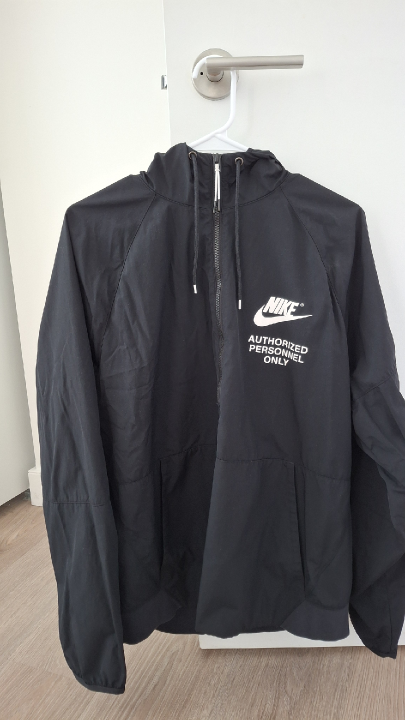 Selling a Nike windbreaker jacket in black, size XXL. It's in great condition and ready for a new owner! Features the Nike logo and 'Authorized Personnel Only' on the back. Perfect for staying protected from the wind!