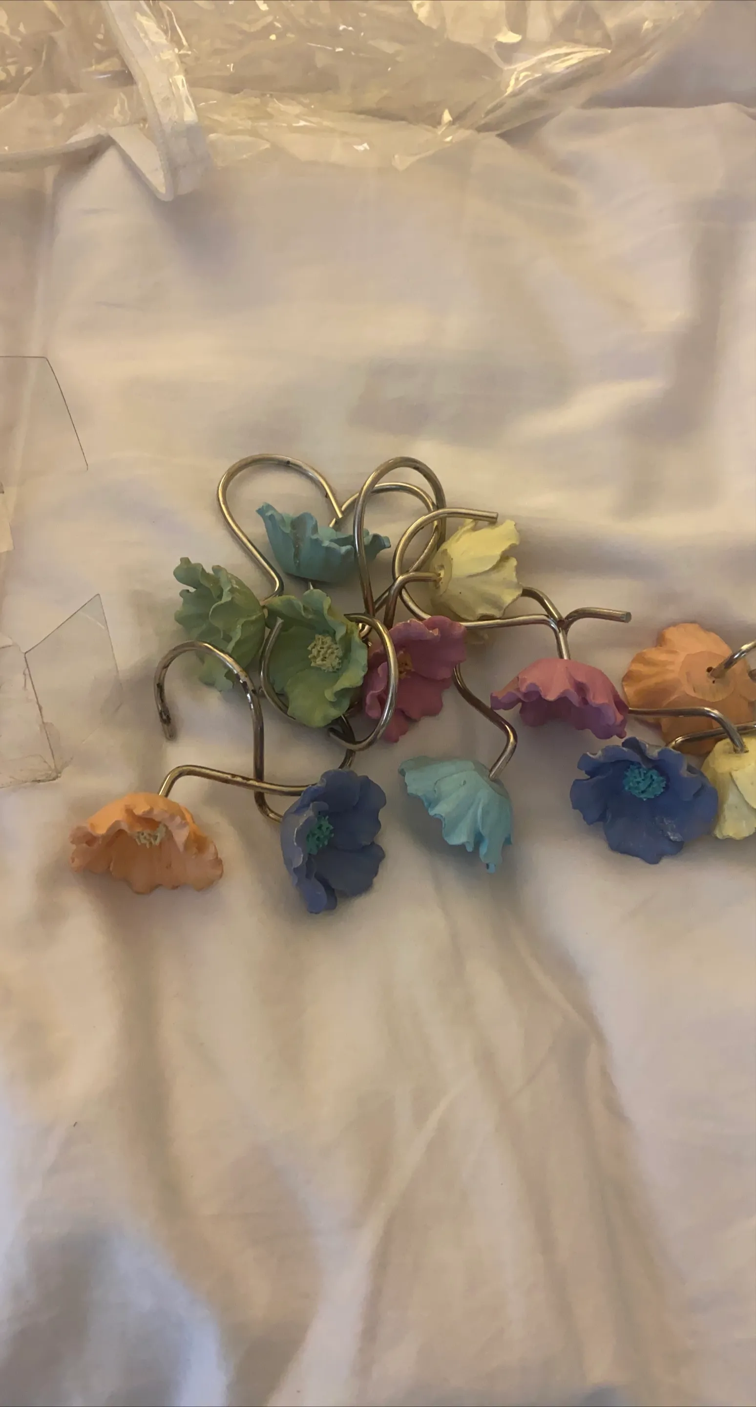 Add a touch of spring to your bathroom with these cute floral shower curtain hooks! They feature a variety of pastel colours including blue, green, pink, yellow and peach. There are 12 in the set, perfect for a standard shower curtain rod