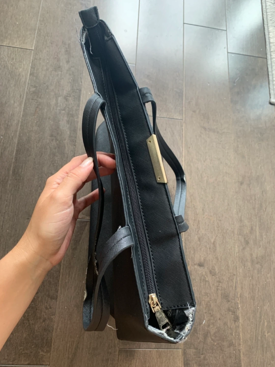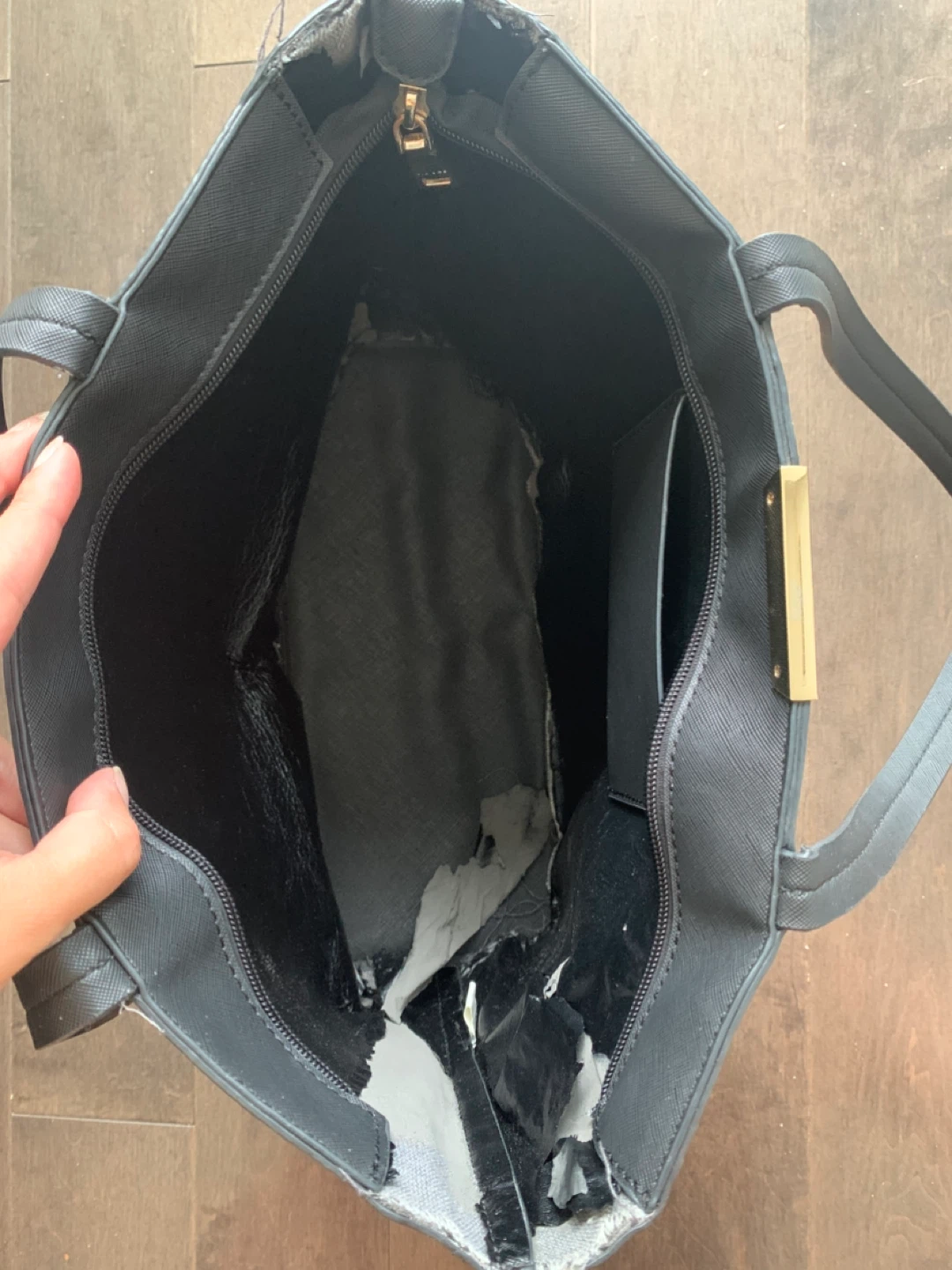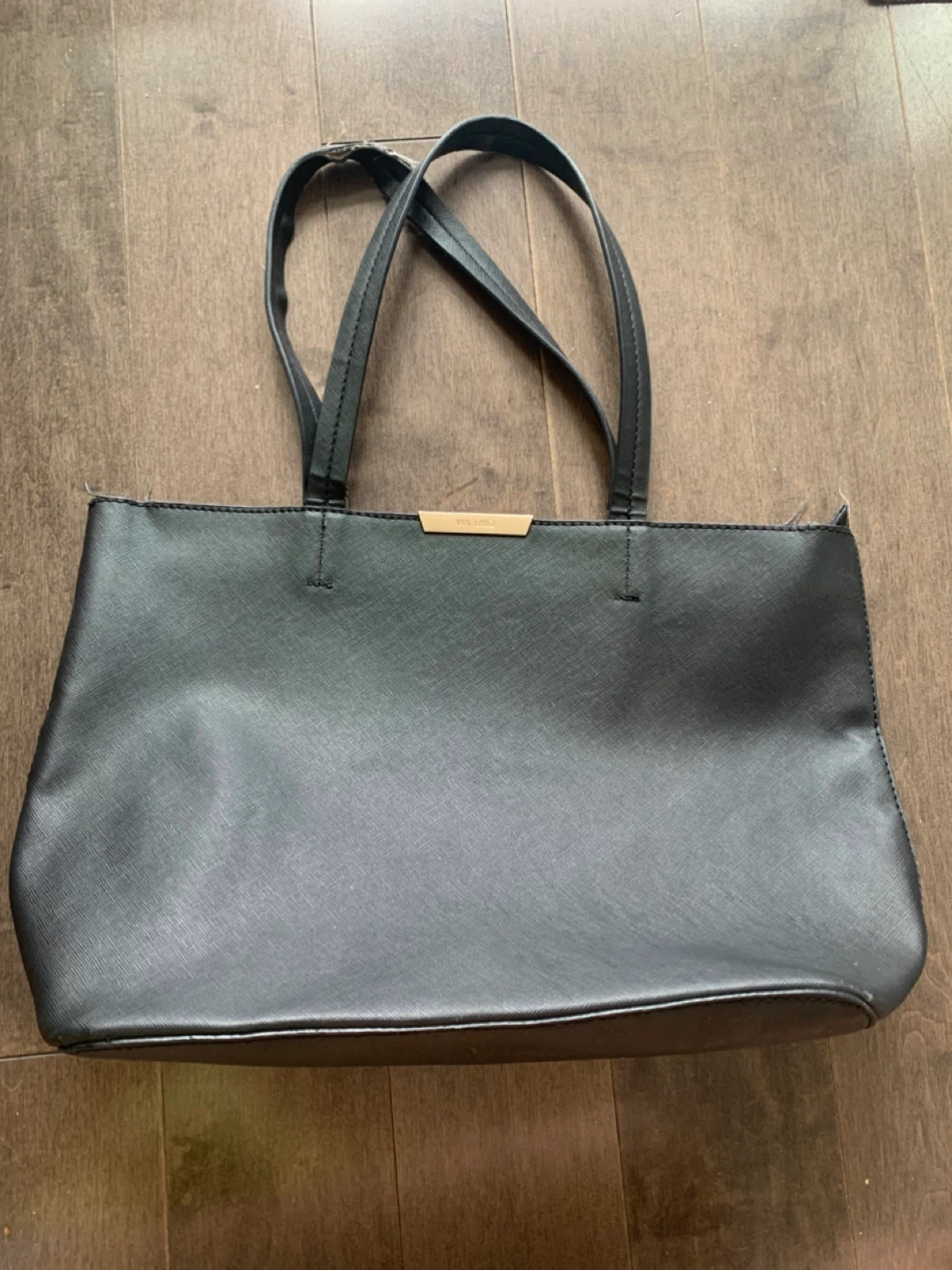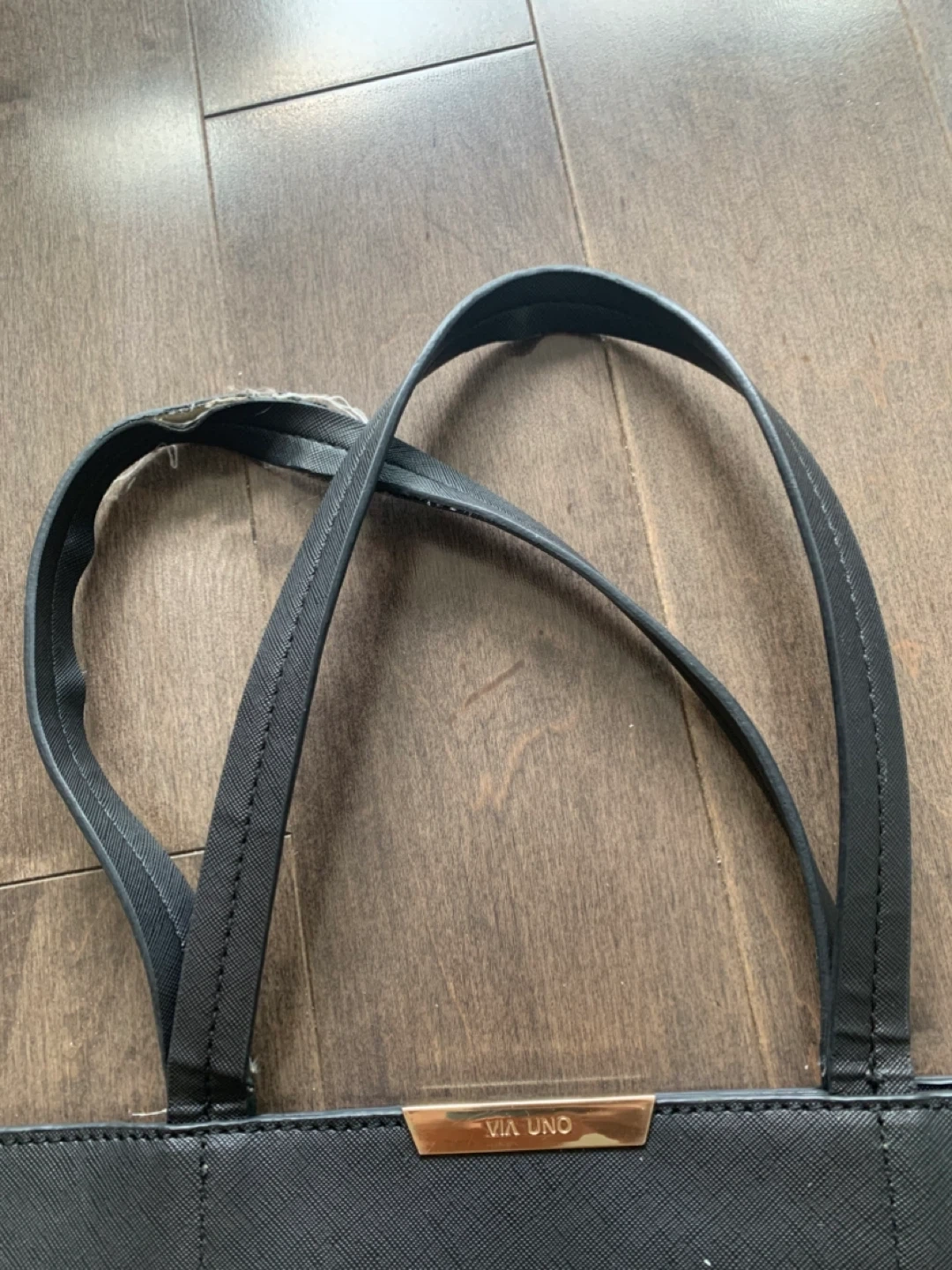 Black Via Uno tote bag. The inside is peeling and the handles are a little worn too, as shown in the photos, but still functional when closed.