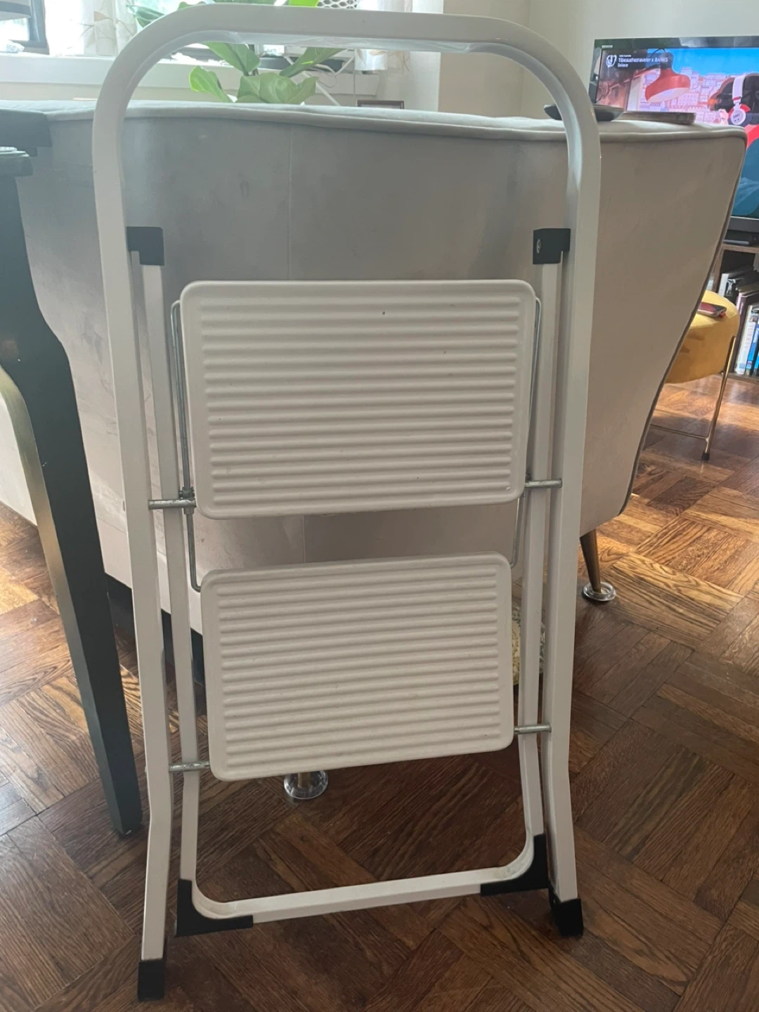 Selling a practically brand new white folding step stool! It's super handy for reaching those high shelves or doing small tasks around the house. It's lightweight and folds up easily for storage, so it won't take up too much space. Perfect for any home!