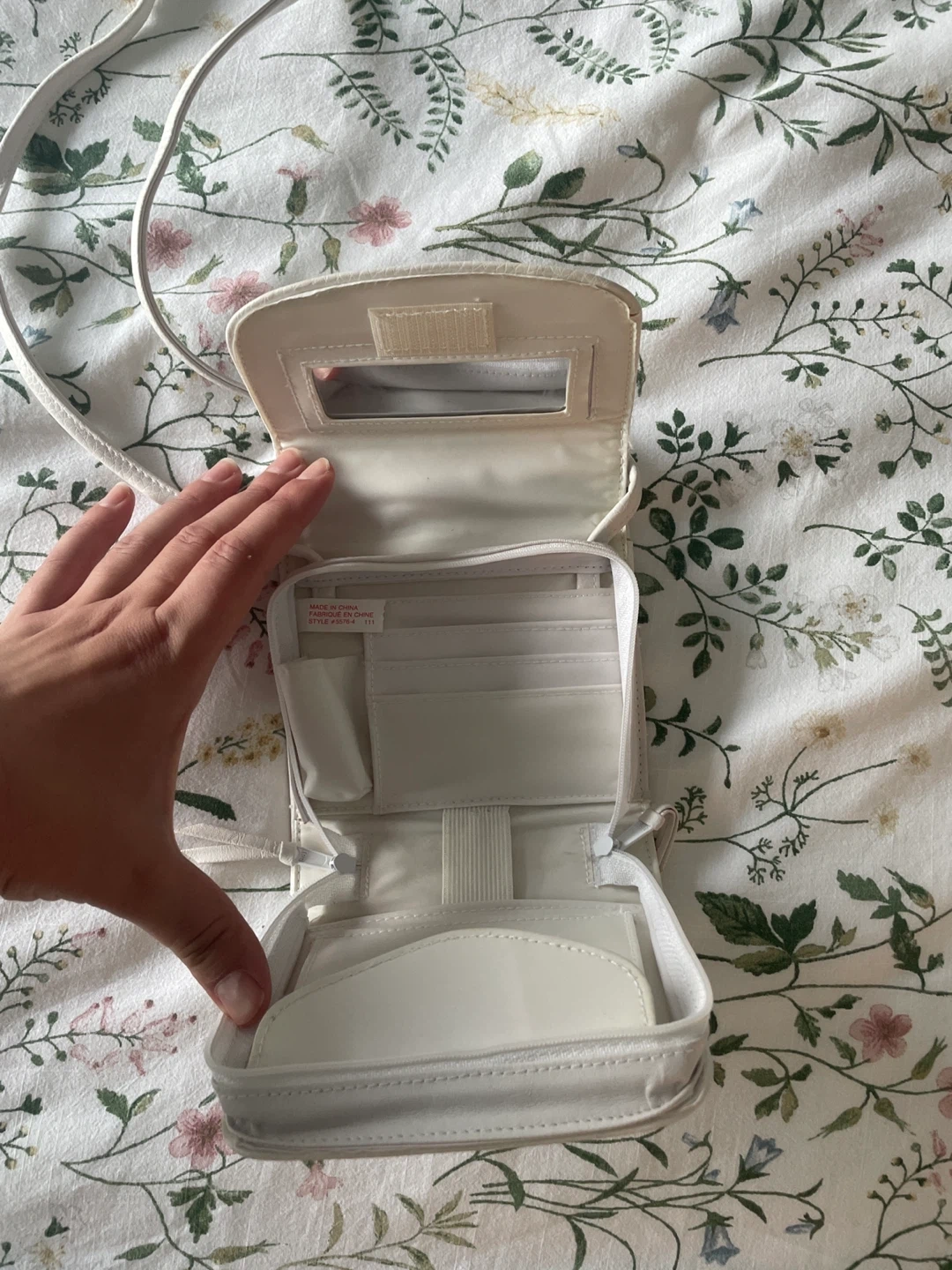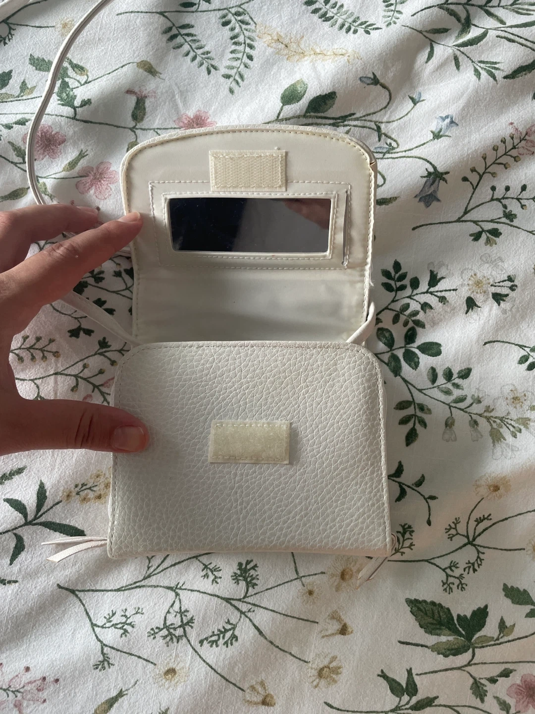 This is a cute little white crossbody bag! It features a small mirror inside and has several compartments for cards and other small items. The bag is in great condition and ready for a new home