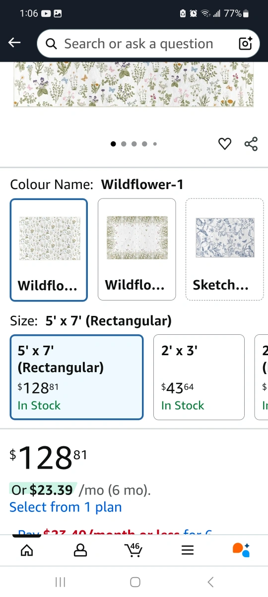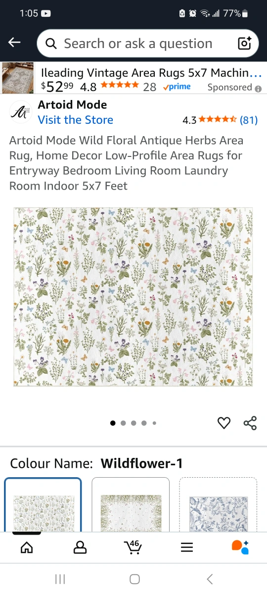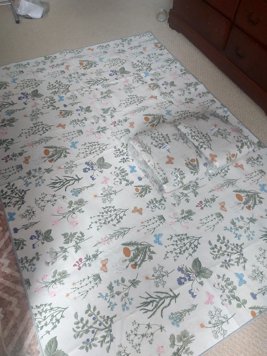 I'm selling a brand new Artoid Mode area rug! It's a beautiful wildflower design and measures 5x7 feet. It is anti-fading, machine washable, and high quality!