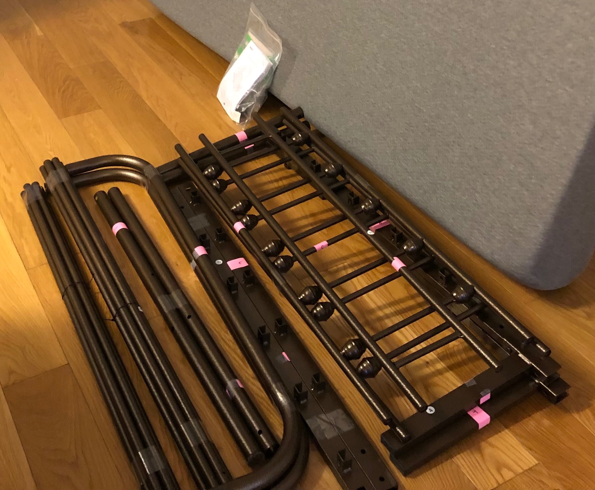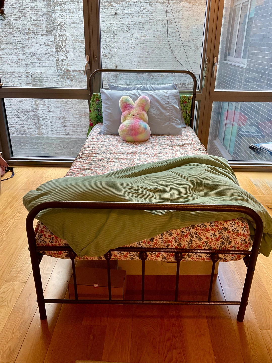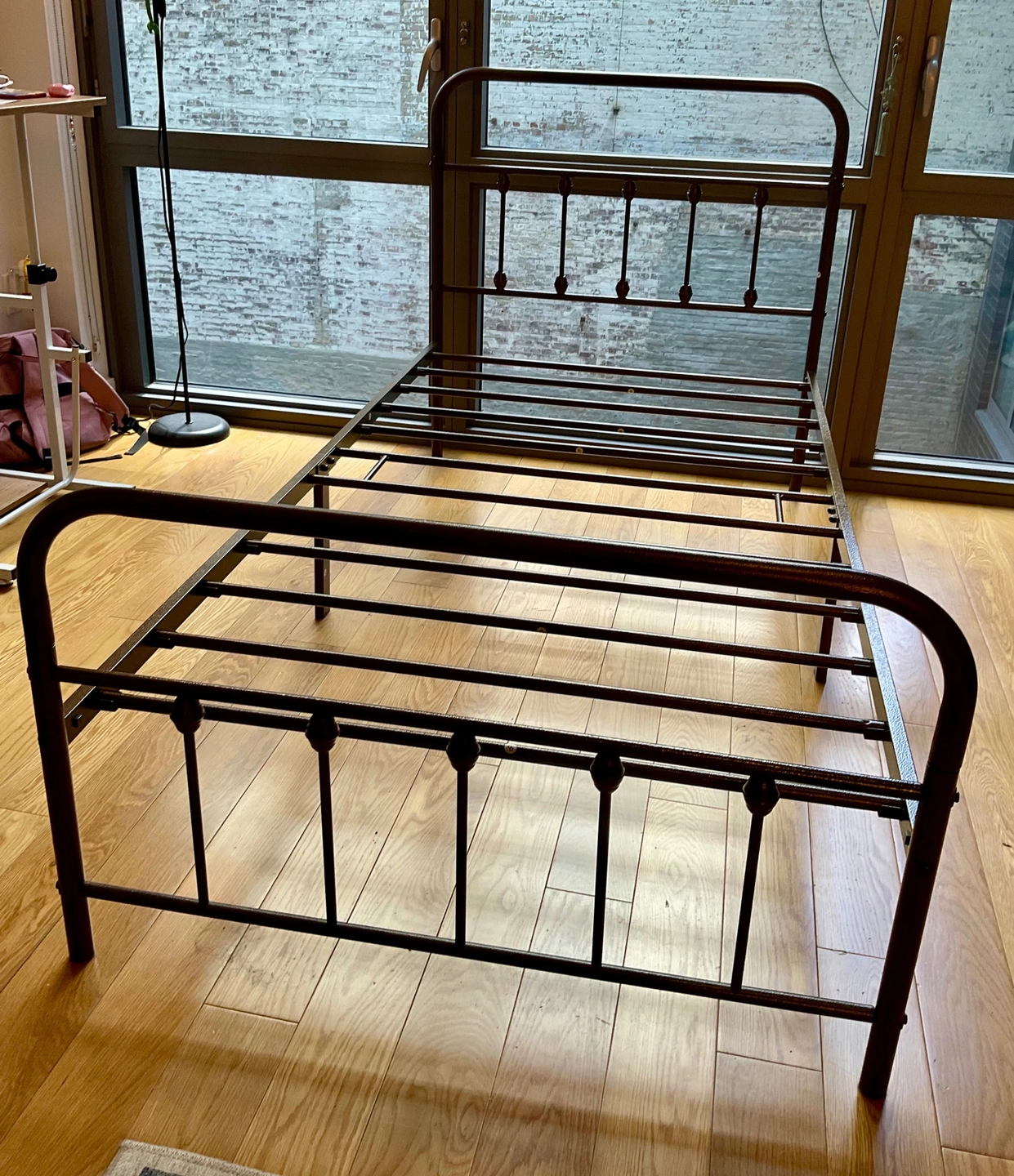 Iron bedframe in like new condition, used for less than a year. Pickup in North Hell’s Kitchen. Has been disassembled for easier transport (assembly instructions, parts, and tools included and labeled for convenience). Originally purchased for $84.