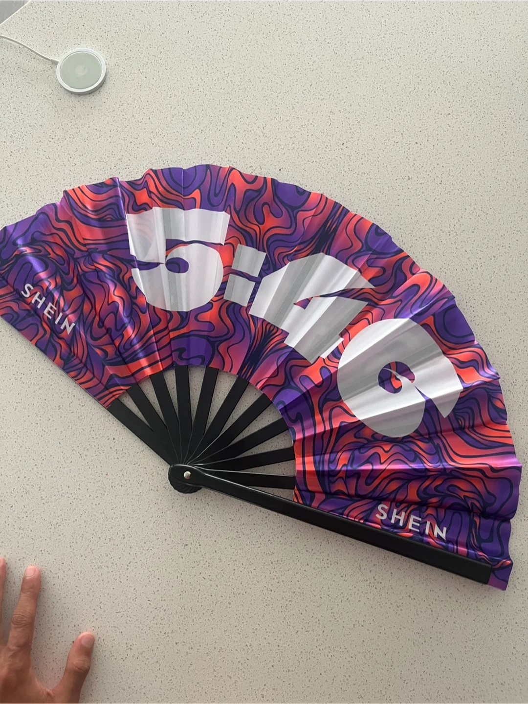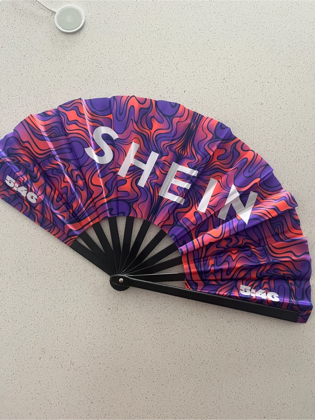 Giving away a fun Shein hand fan! It features a vibrant purple and orange wavy pattern with black accents. Perfect for staying cool and adding a pop of colour to any outfit