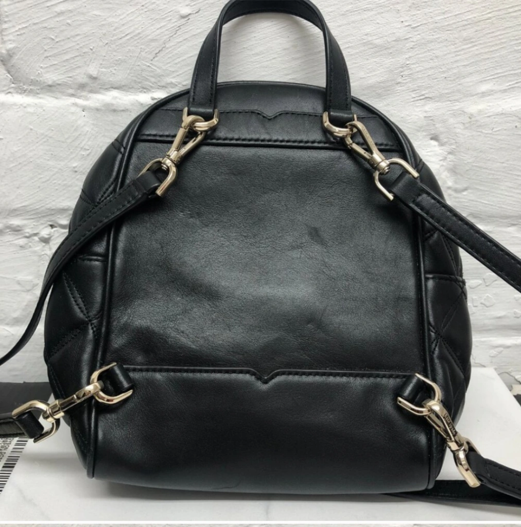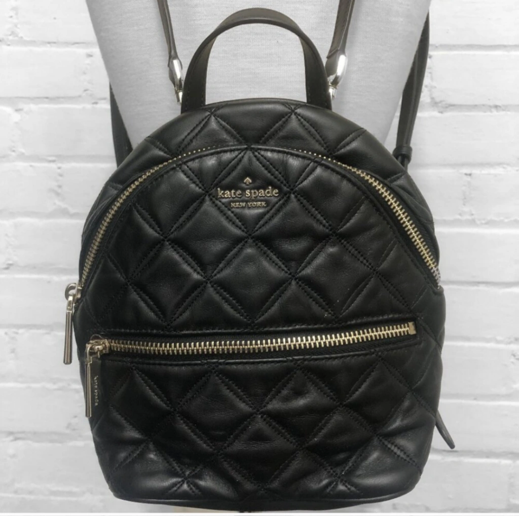 Quilted leather backpack by Kate Spade. Featuring gold zippers and hardware. Minor wear on the bottom back and light on the back. see pics . measures approximately H 9 inches x L 9 " inches W 3" inches. adjustable straps