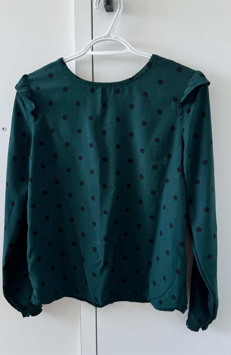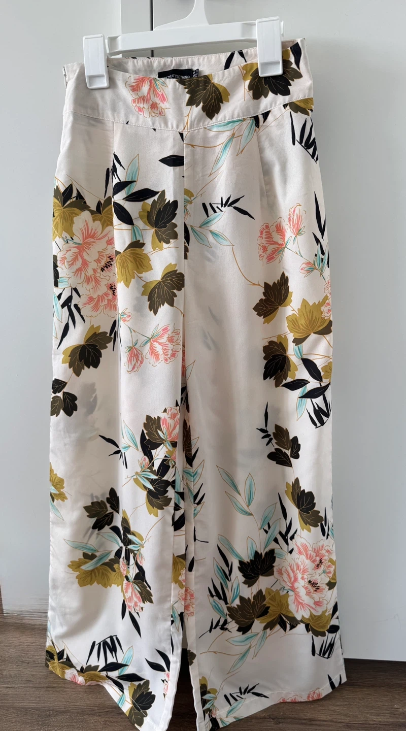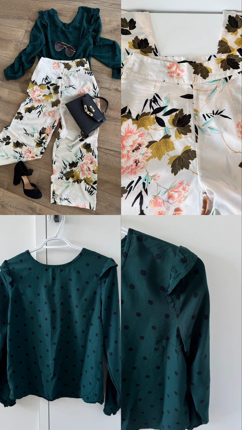 Selling a cute set including a Kiabi green blouse with black polka dots and floral print pants from prettylittlethings Xs/S. The blouse is a size S but can fit XS . Perfect for a stylish, coordinated look!