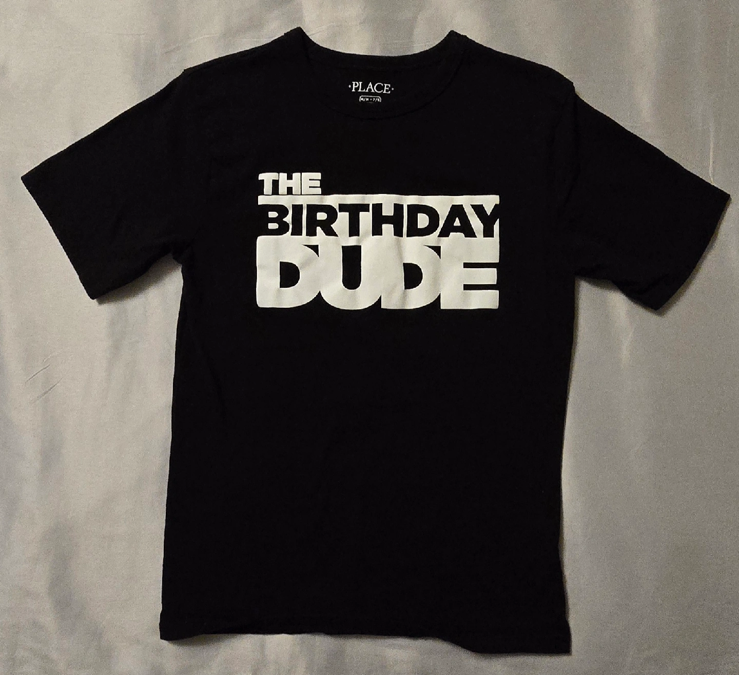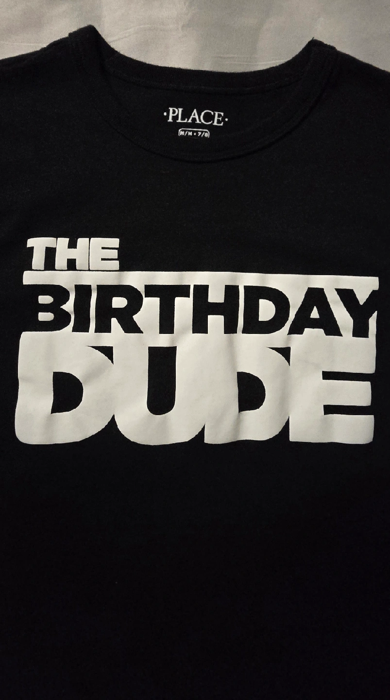 Selling a black 'The Birthday Dude' t-shirt from The Children's Place. It's a size M (7/8) and in great condition! Perfect for a birthday celebration!