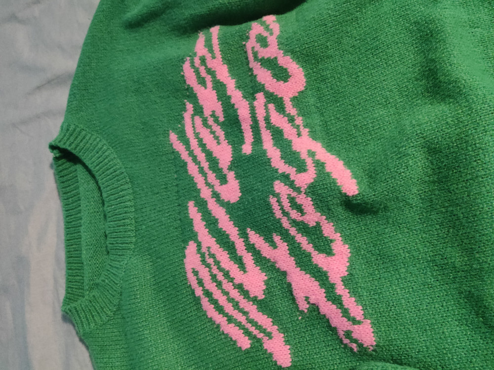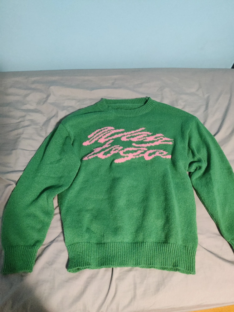 Selling a new worn green crewneck sweater. It's in great condition and has a unique pink design on the front. Perfect for adding colour to your wardrobe