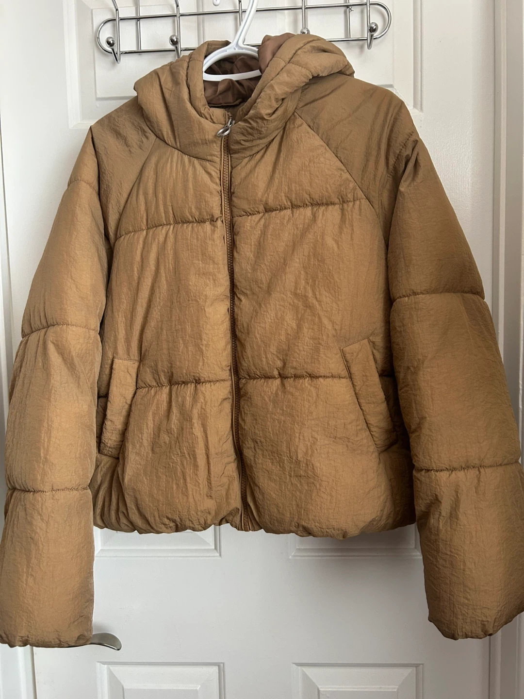 11Selling a cozy brown puffer jacket! It's in great condition and perfect for the cooler weather. The jacket features a hood and a zip-up front