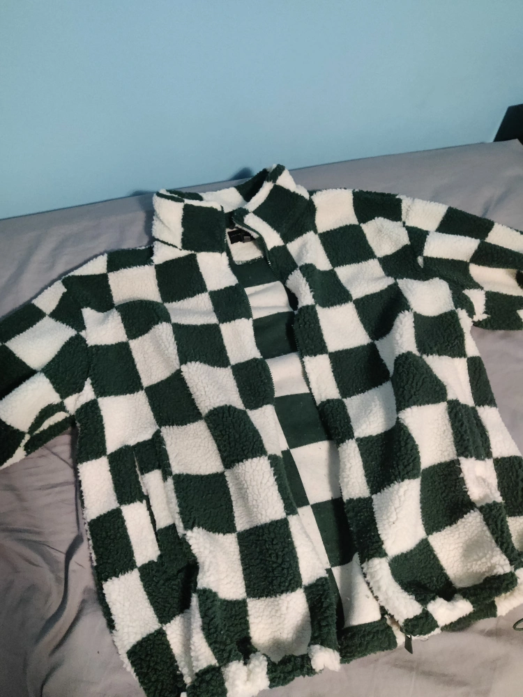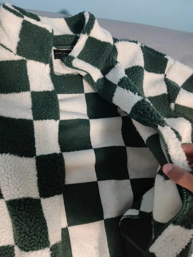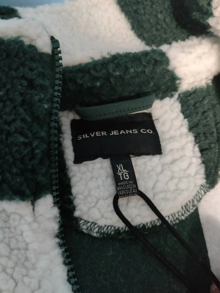 Silver Jeans Co. sherpa jacket. features a green and white checkerboard pattern and is a size XL. Perfect for staying warm and stylish.