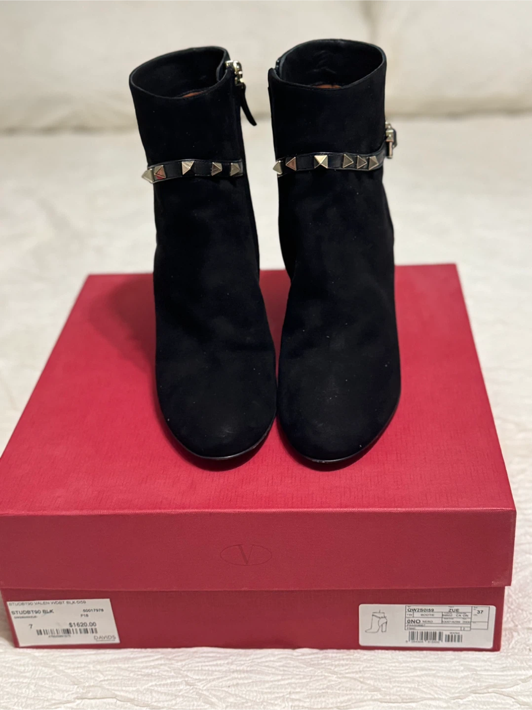 Selling a pair of Valentino Stud Sign Ankle Suede Boots in black, size 7. They come with the original box. Originally bought for $1620.00
