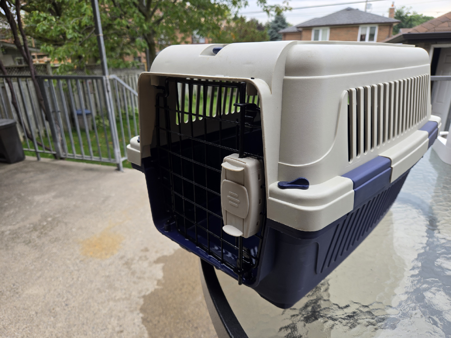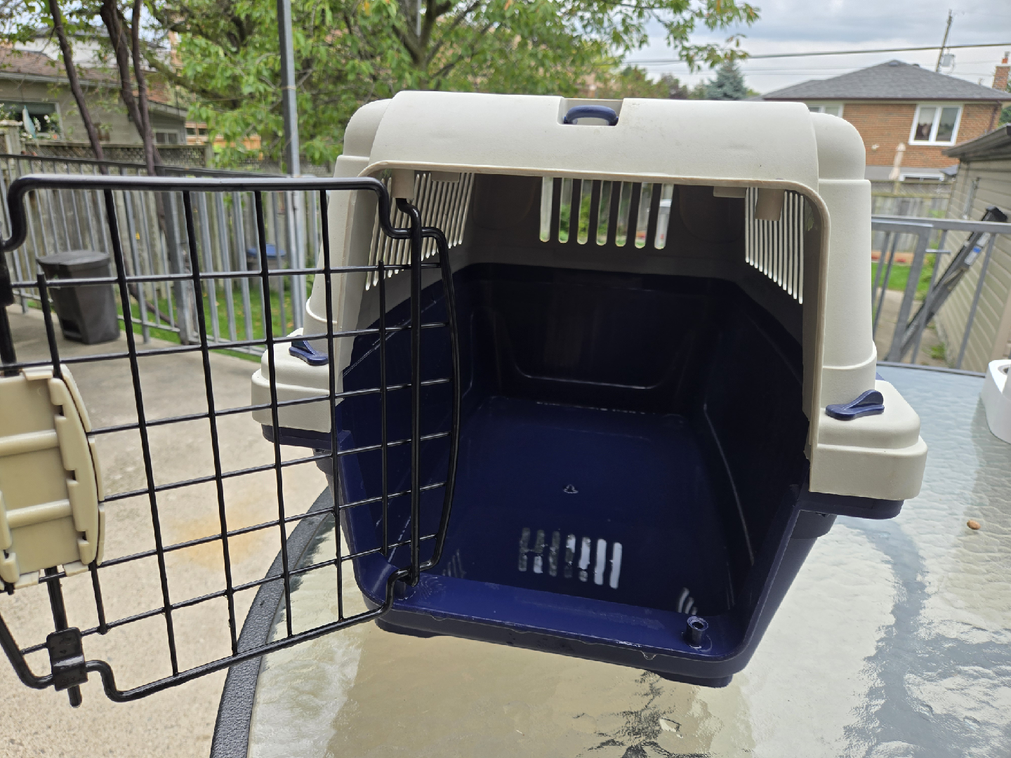 Selling a pet carrier in good condition! It's a sturdy carrier, perfect for vet visits or travel. The carrier is blue and white with a metal door. It has some signs of use, but is still in great shape and ready for a new furry friend!