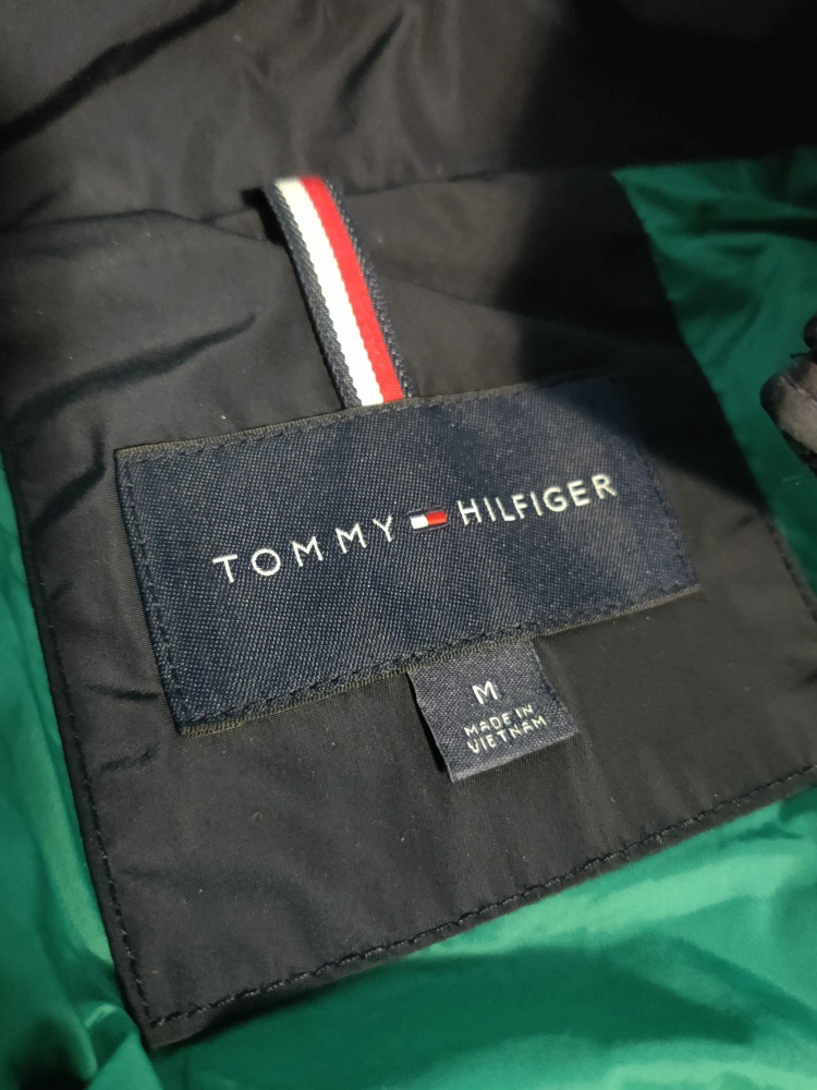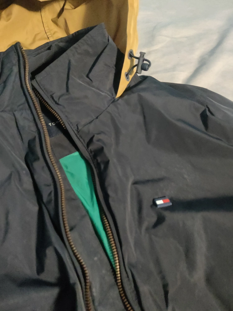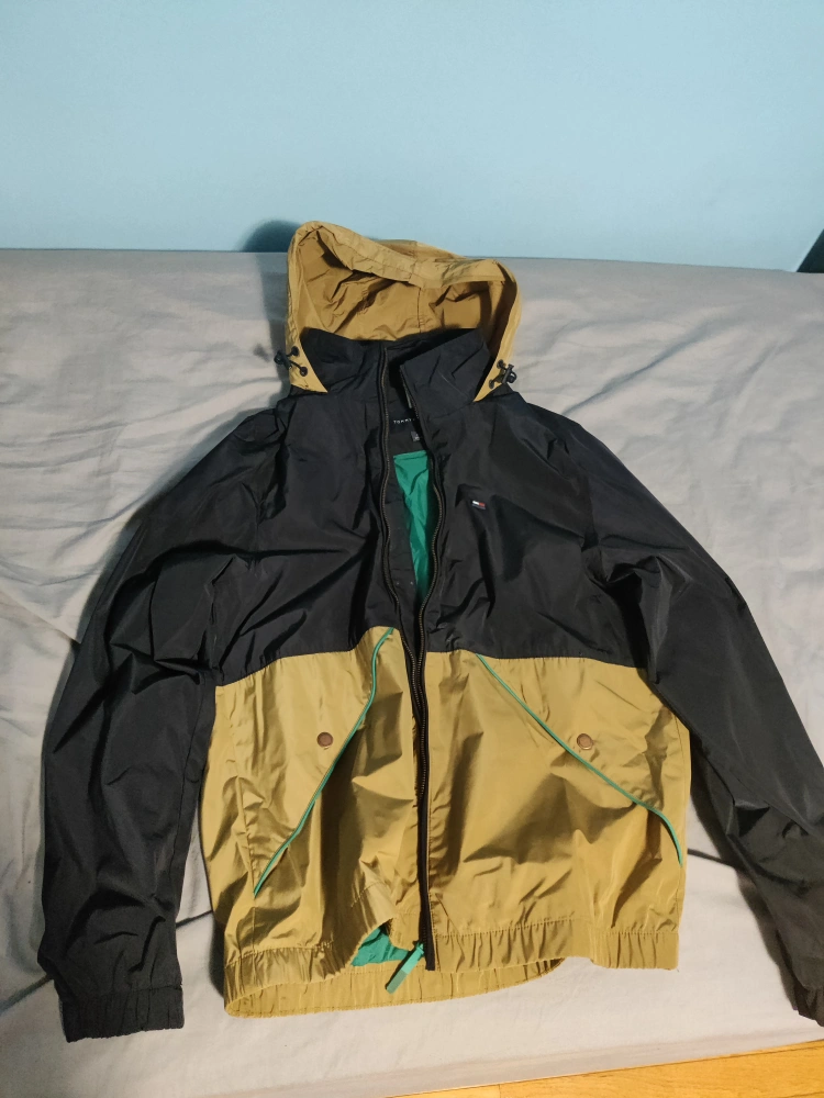 Tommy Hilfiger jacket in size medium. The jacket is black and tan with a green interior lining. Great for spring or fall weather