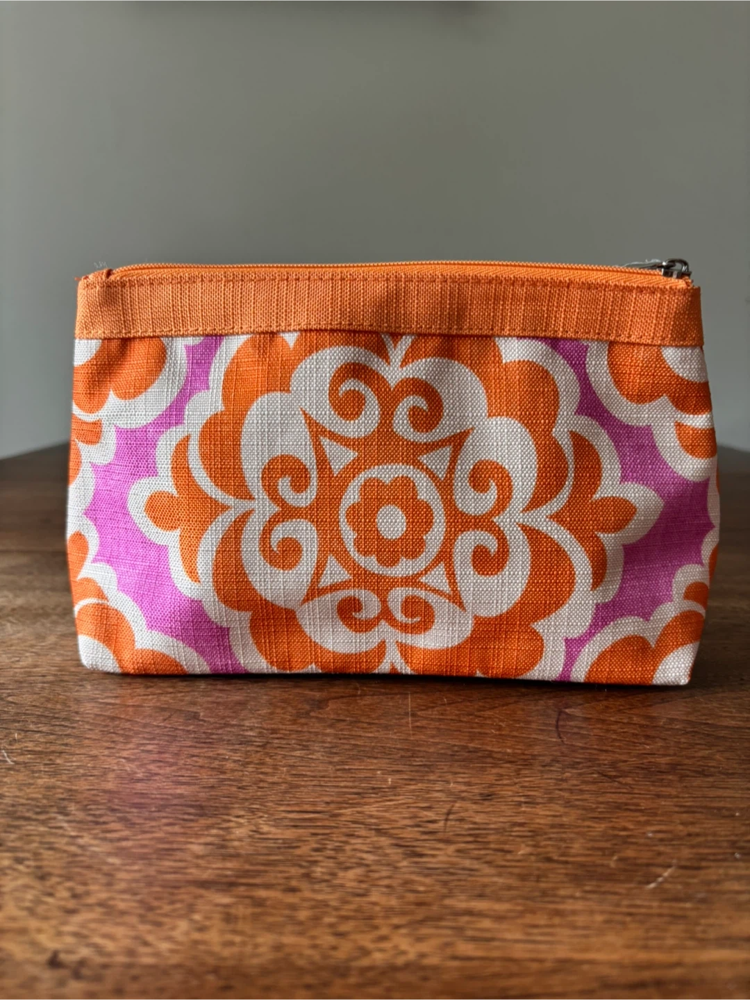 Brand new! This cute zipper pouch is perfect for storing your essentials! It features a fun floral pattern in orange, pink, and white. Great for makeup, toiletries, or other small items. 9” pint, 2.5” wide and 6” tall. Cash only.