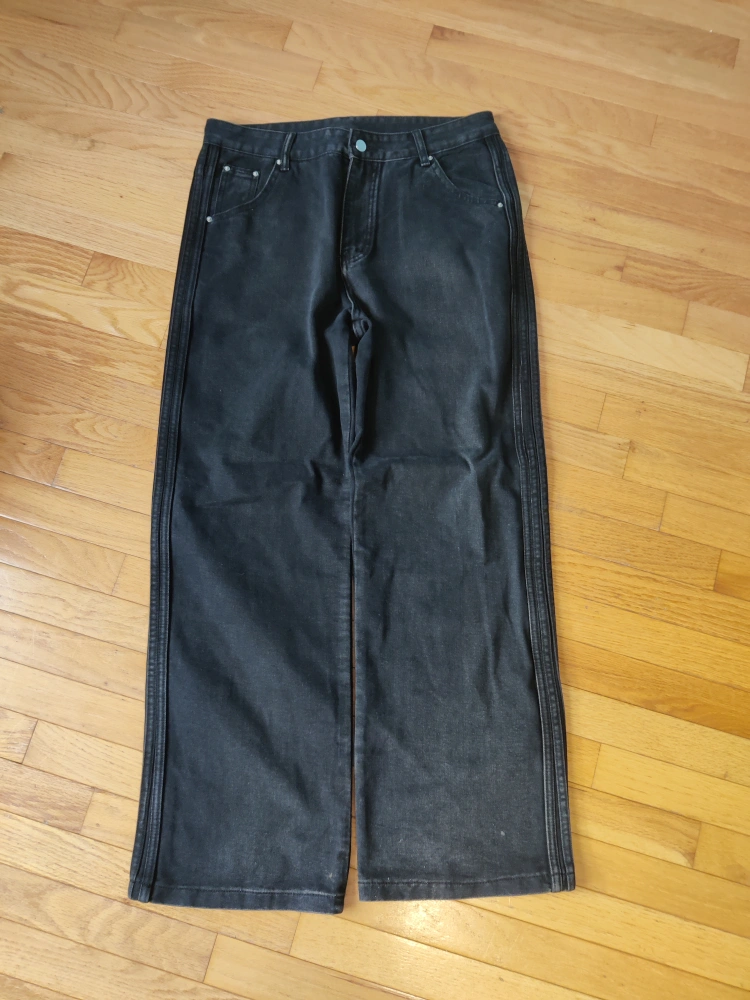 Selling a pair of NF wide leg jeans in black. These jeans have a unique design with detailed addidas-like 5 stripe stritching along the sides. Never worn