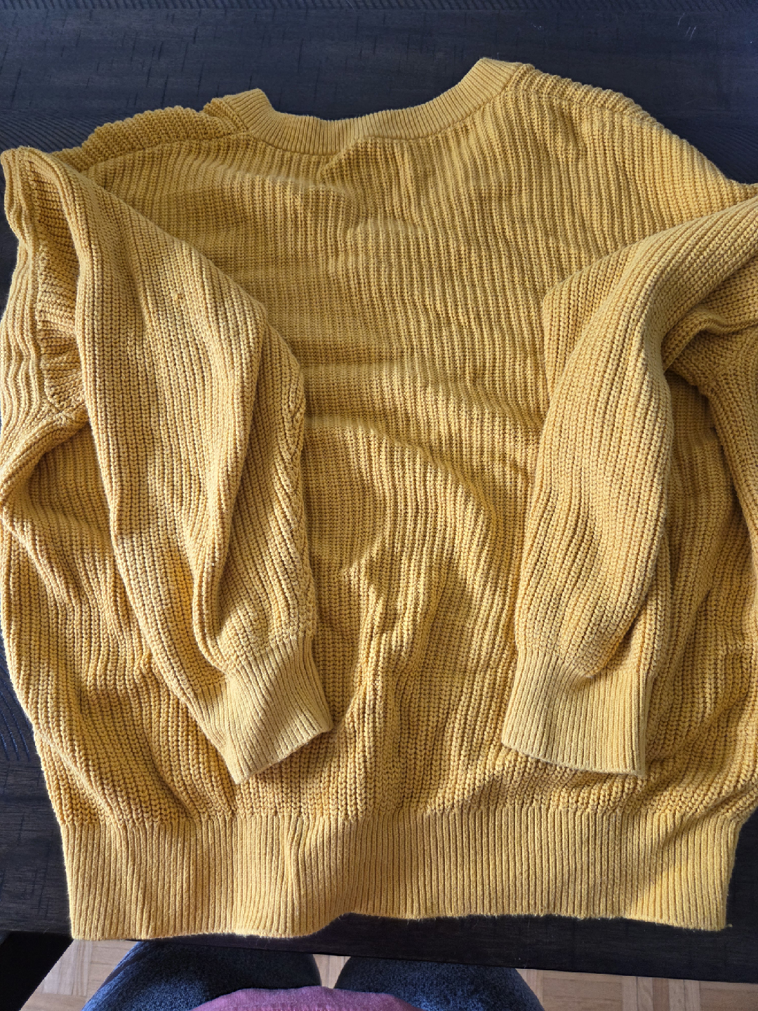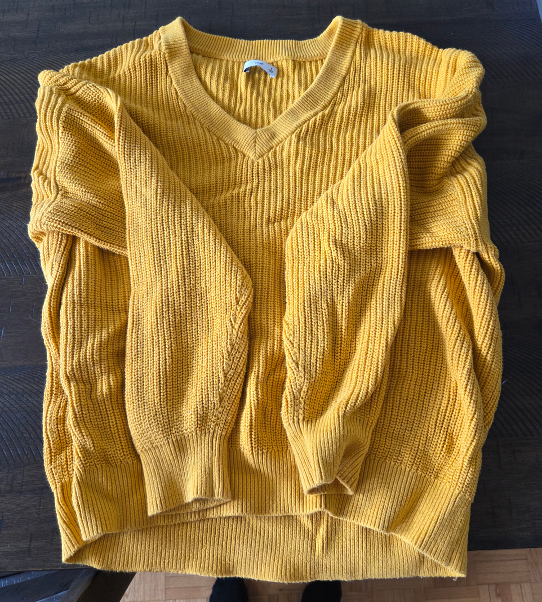 Cozy TNA sweater in a lovely mustard yellow colour! It's a V-neck style and size small. Perfect for layering or wearing on its own. In great condition! Get ready and cozy this fall with this vibrant sweater.