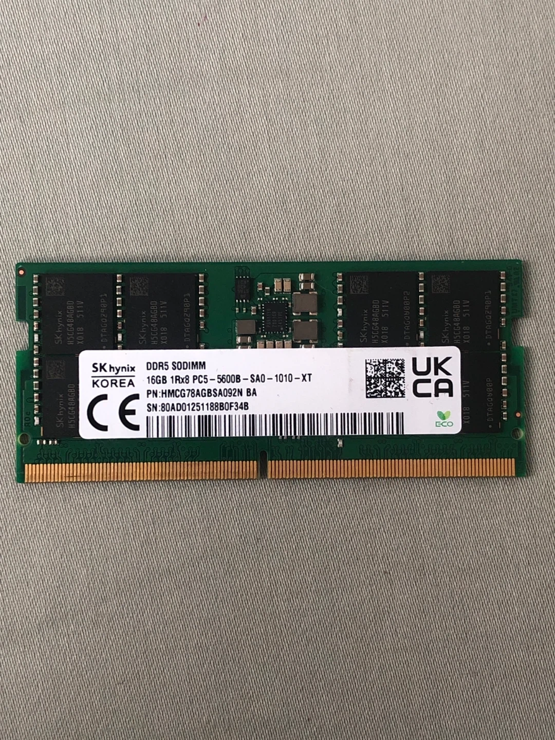Selling two SK Hynix 16GB DDR5 SODIMM RAM sticks. They are 16GB 1Rx8 PC5-5600B -SA0-1010-XT. 2 pieces available. $35 for each. $60 for both.