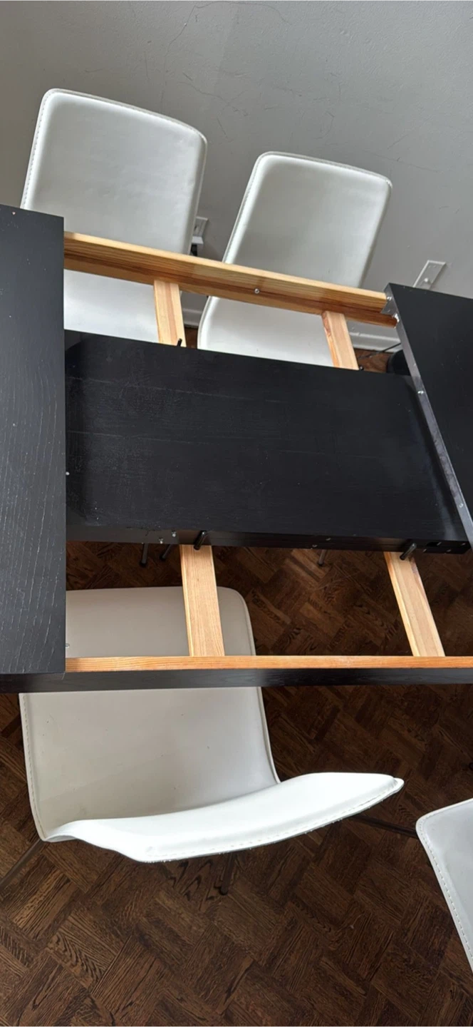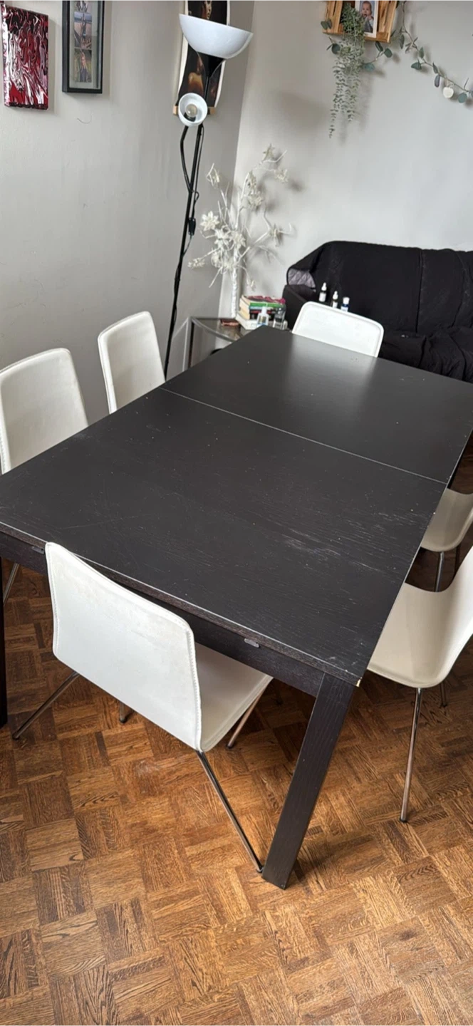 Selling a dining table in good condition! It's extendable, so it's perfect for both everyday use and when you have guests over. ( Up to 12 ppl) The table is black and comes without chairs. It's a great addition to any dining space! Some minor imperfection as shows in pictures