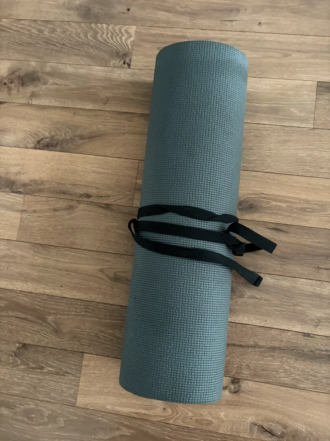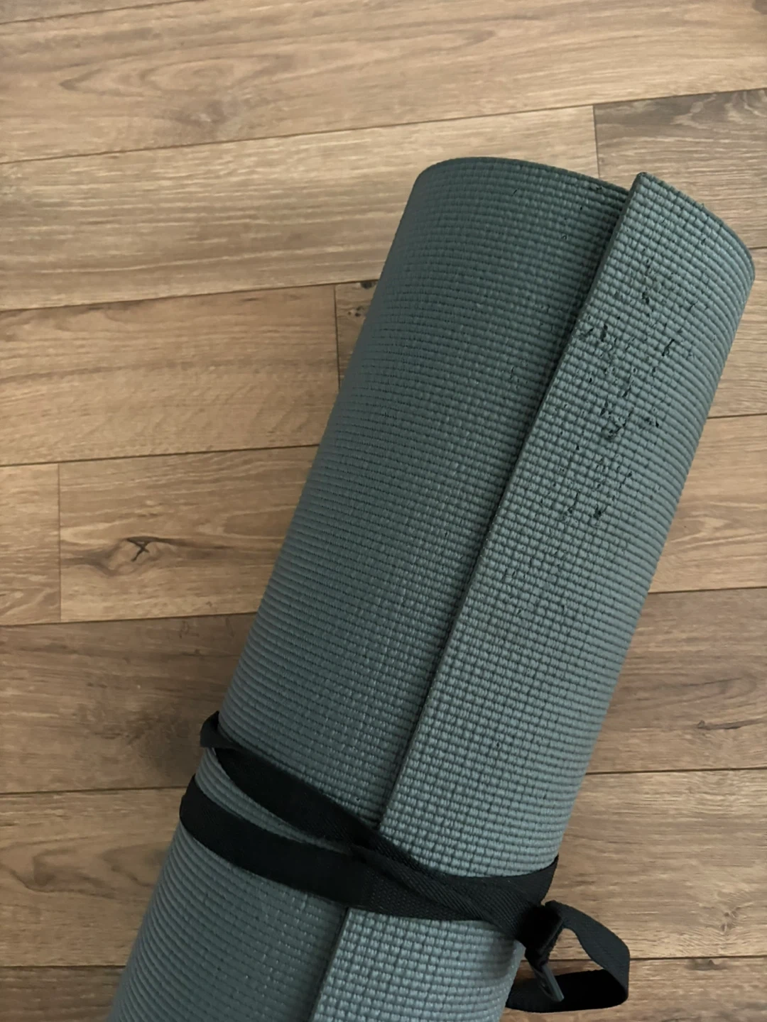 Selling a yoga mat in great condition! It's a nice grey colour and comes with a black strap to keep it rolled up. Mild fraying at one edge (see second pic) but is still functional and does not impact use.