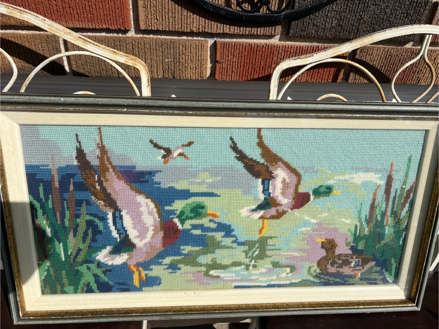 Selling a vintage needlepoint picture in a frame. It depicts a scene with ducks in a pond. The needlepoint is quite detailed and colourful. The frame is in good condition too! 14” X 26”
