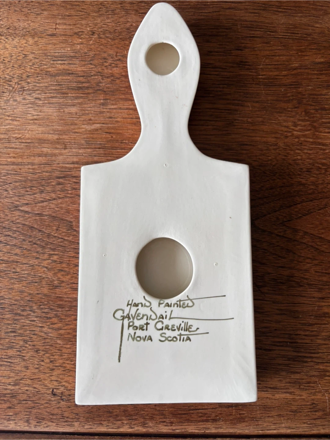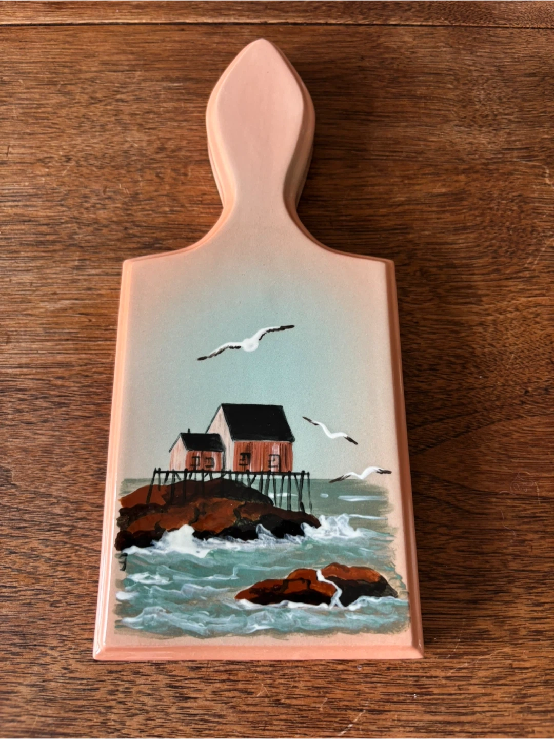 Here's a charming decorative mini cutting board featuring a lovely coastal scene. It's perfect for adding a touch of seaside charm to your kitchen or dining area. The design includes a quaint house on stilts, crashing waves, and seagulls in flight. It's in great condition and ready to find a new home! 9.5” by 4”. Cash only.