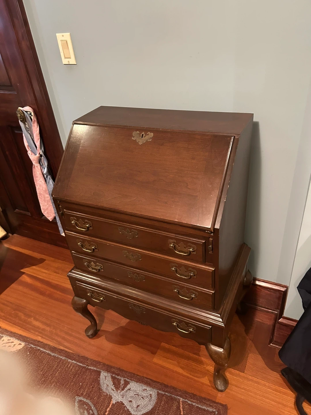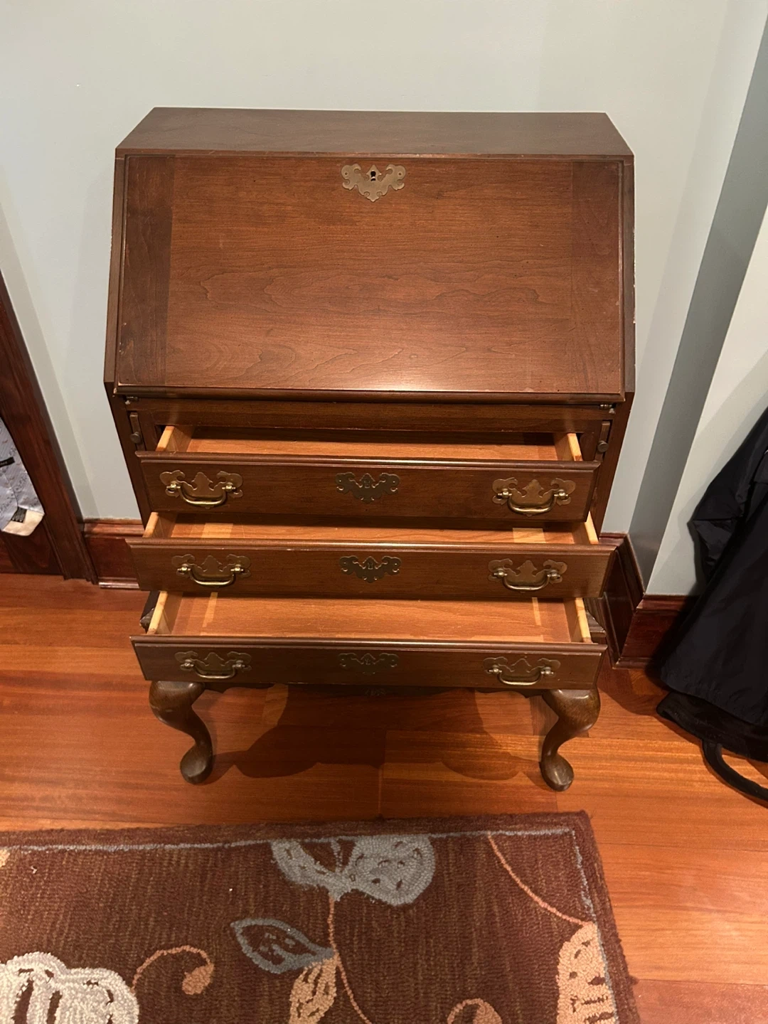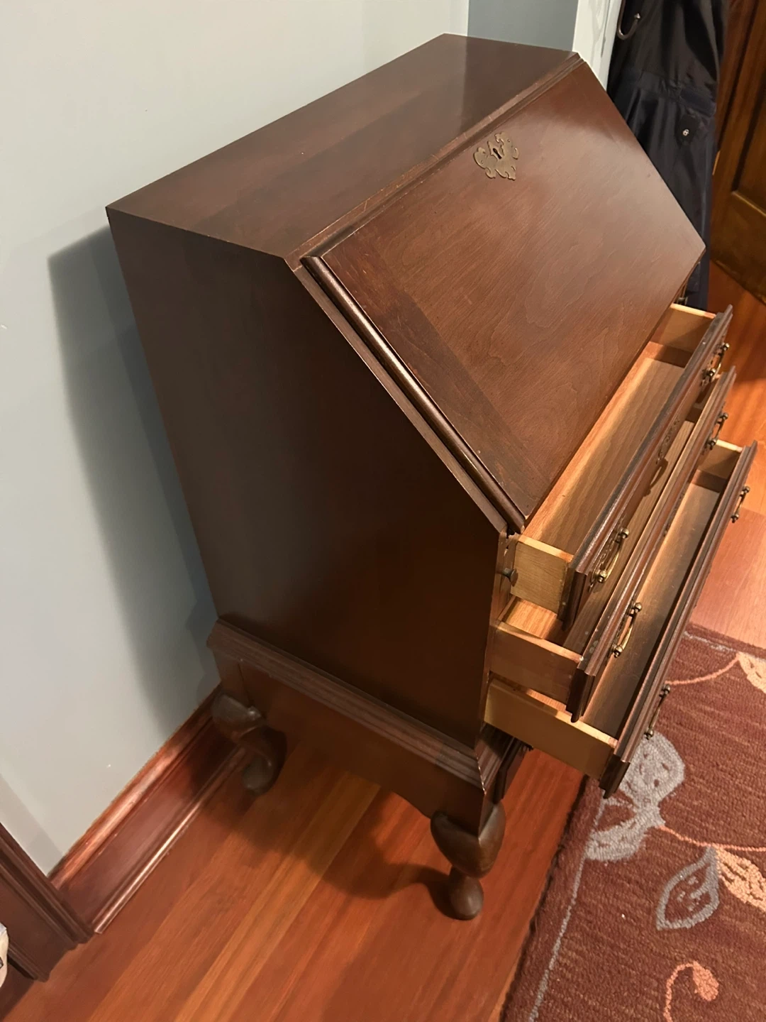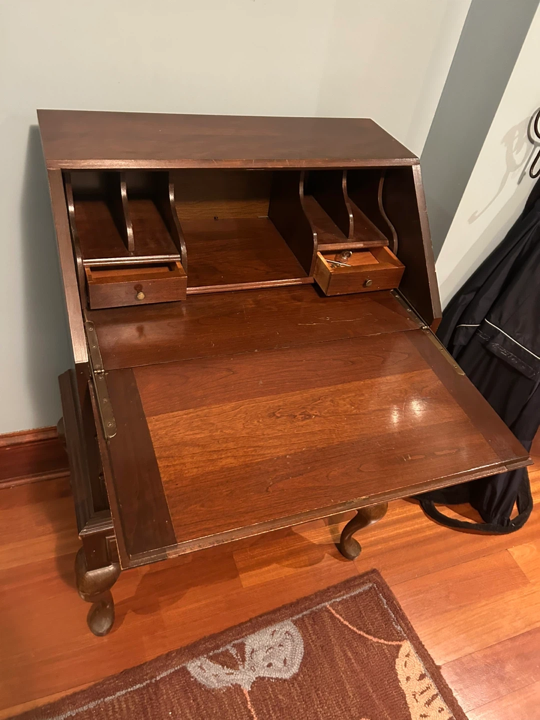 Selling a beautiful antique secretary desk. It features a rich brown wood finish and classic design. The desk has a drop-down writing surface and several drawers for storage. Perfect for adding a touch of vintage charm to your home office or living space Beautiful solid wood desk with drawers and compartments. Fold out writing feature. Antique with brass hardware. 39” high, 27.5” wide, unopened 16” deep-opened 26” deep.