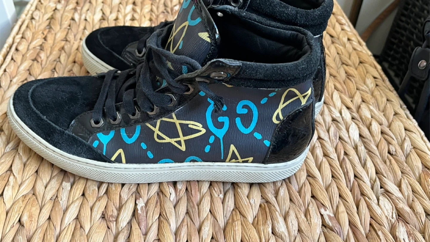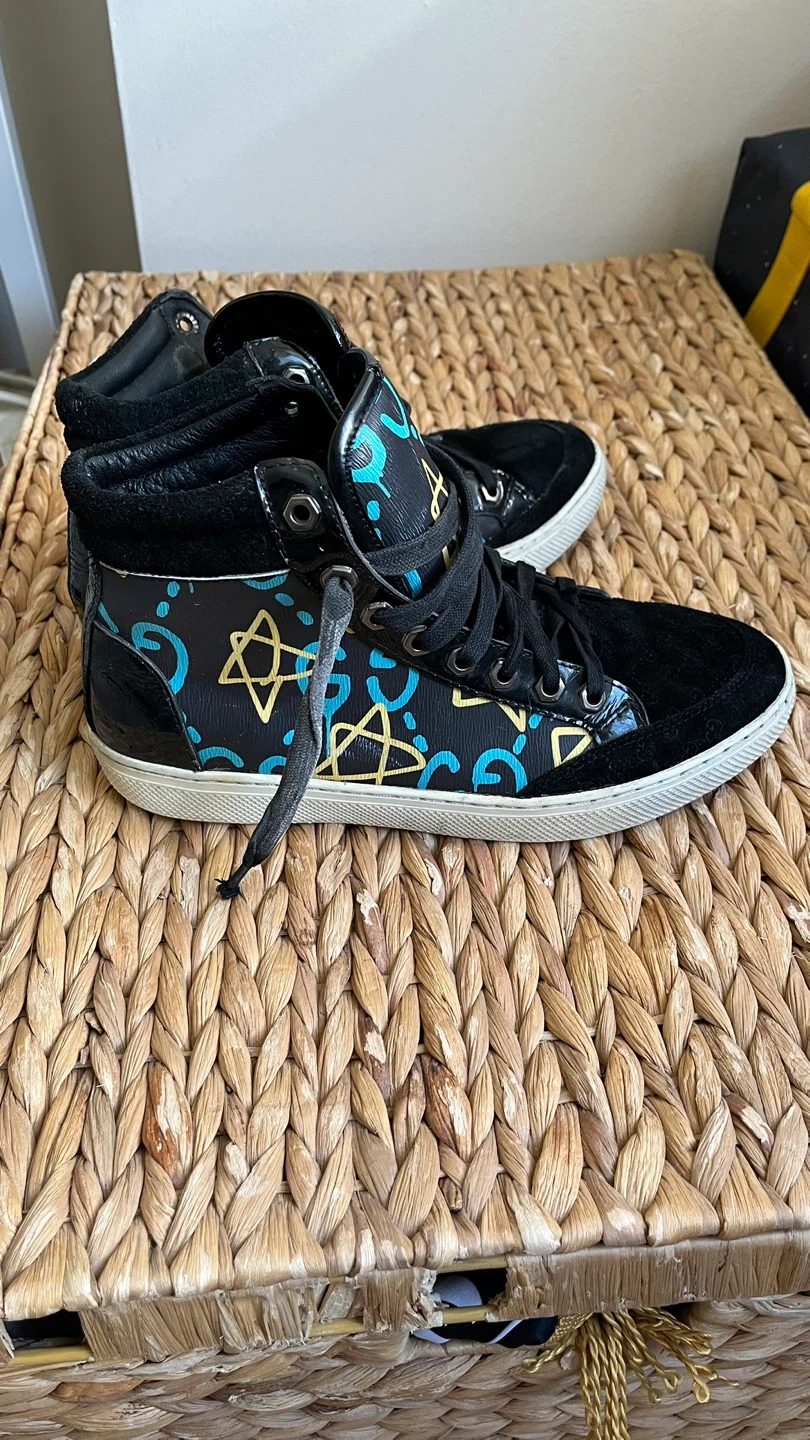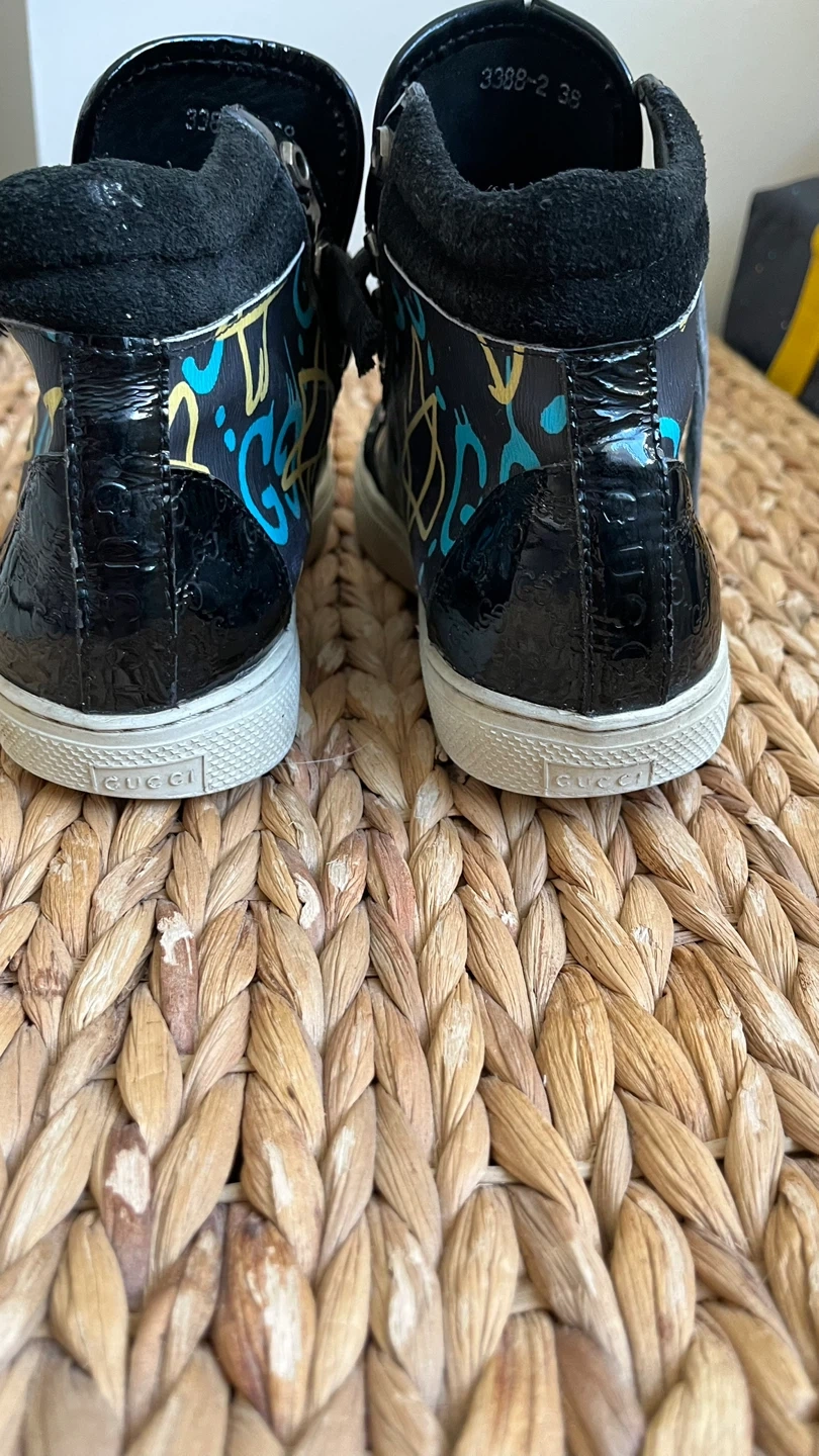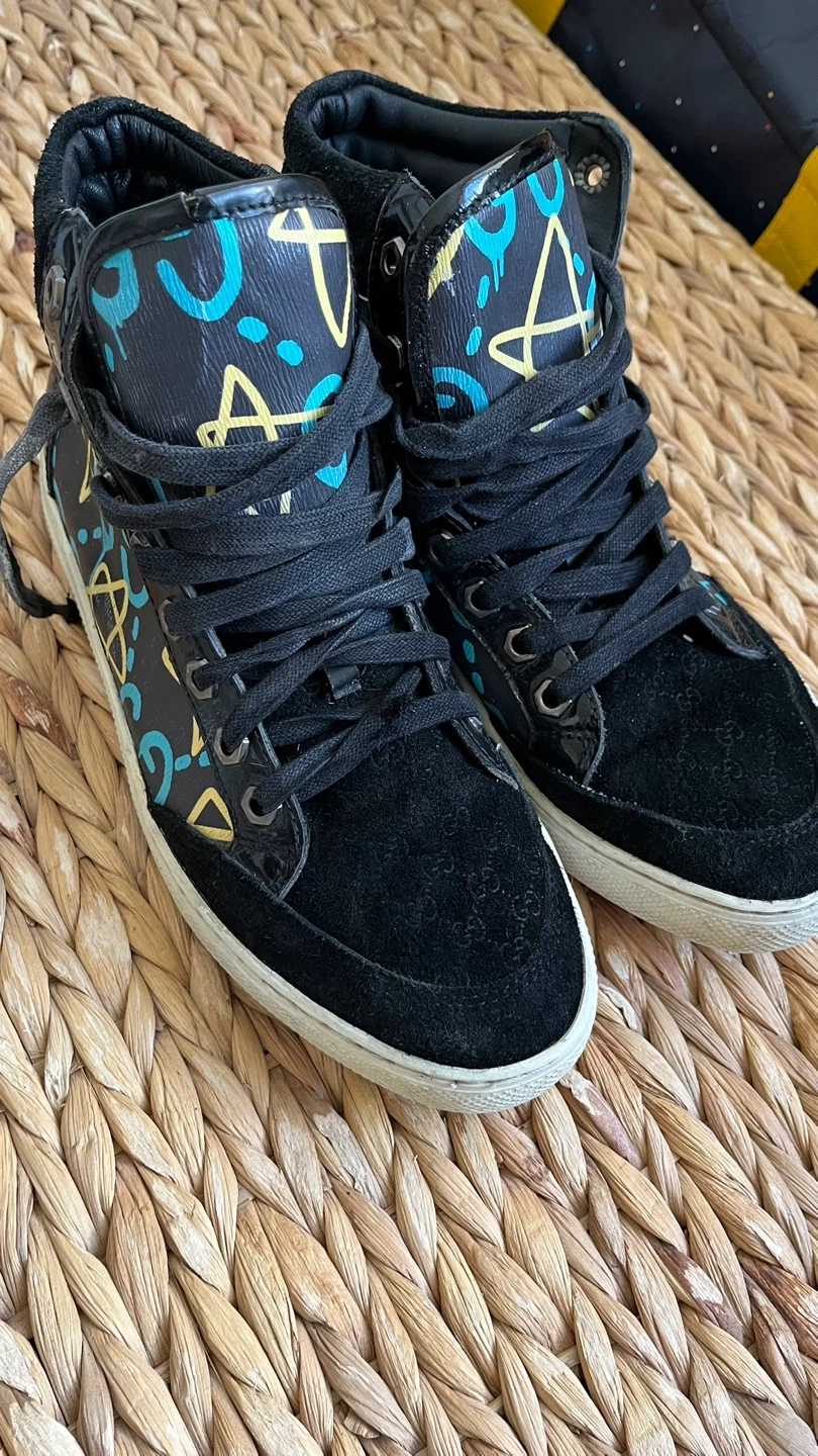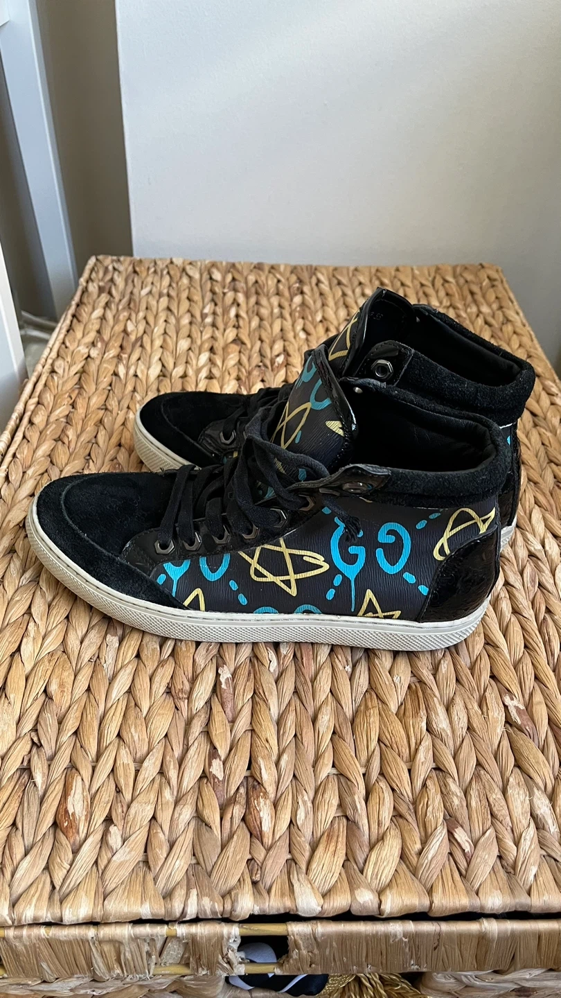 Selling a pair of Gucci high-top sneakers in black. They feature a unique pattern with blue and yellow accents. The shoes are made of suede and patent leather.