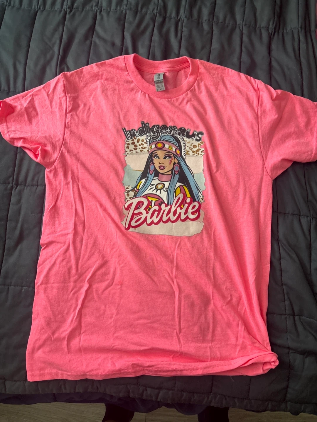 Selling a Gildan brand pink t-shirt featuring an Indigenous Barbie design. It's in great condition and ready for a new home!
