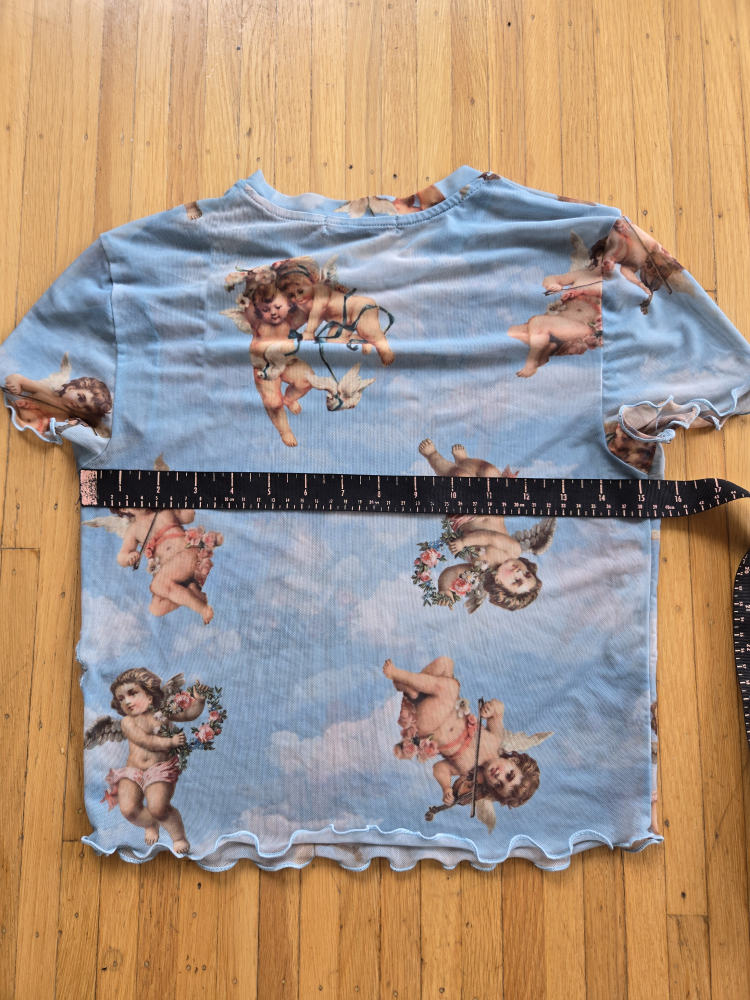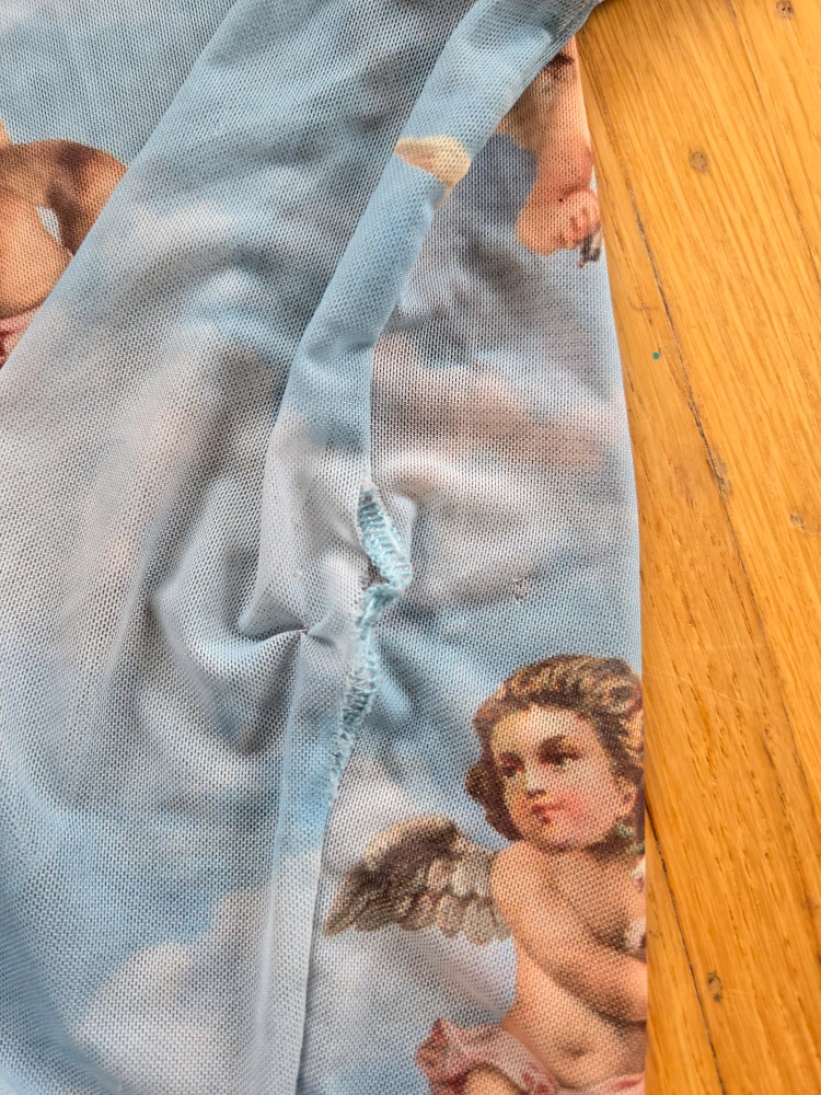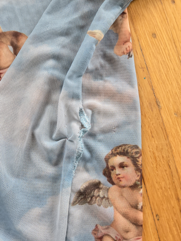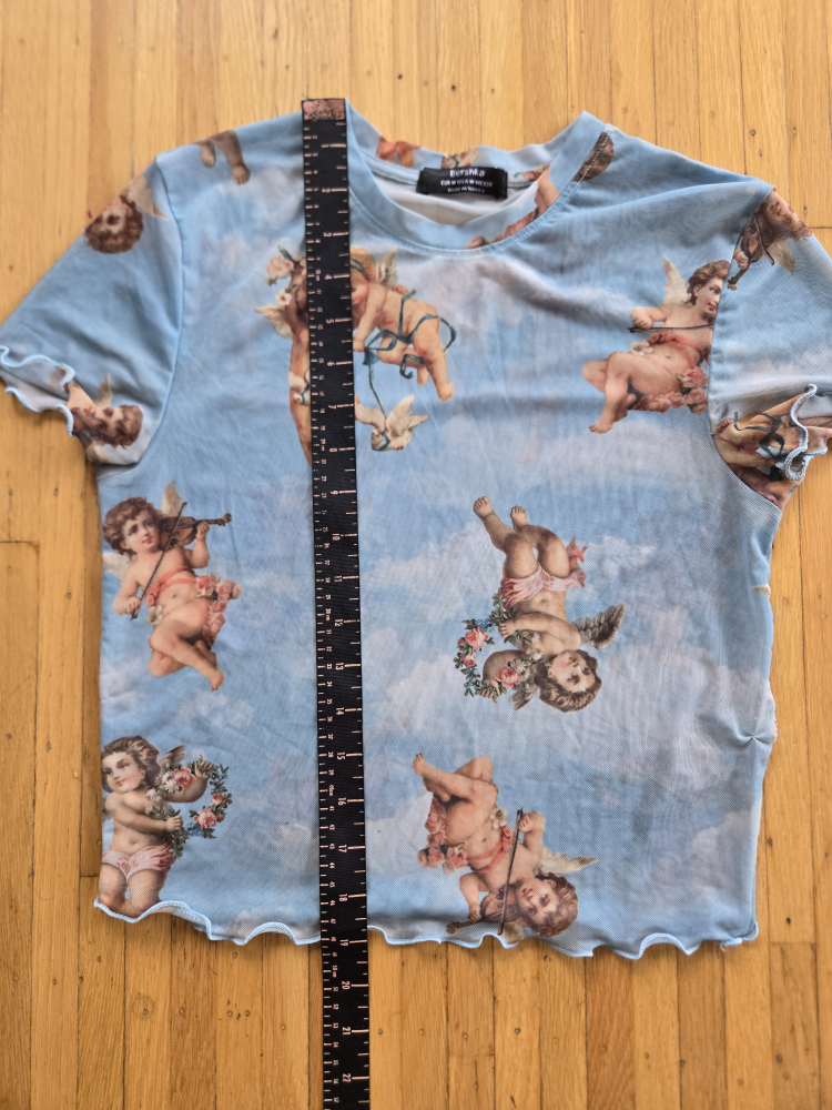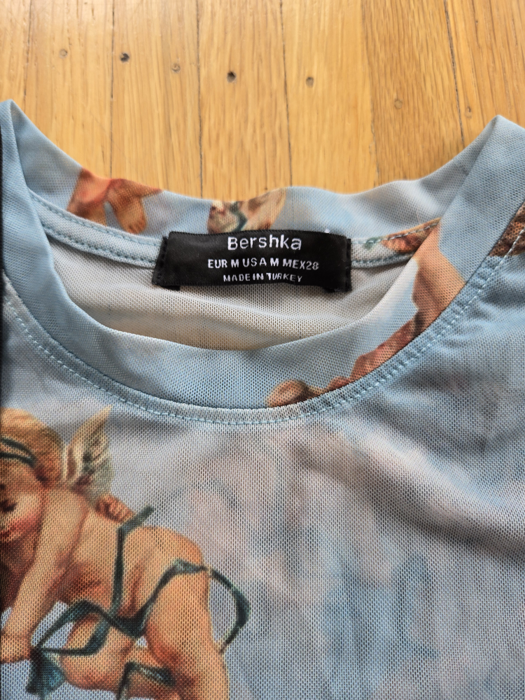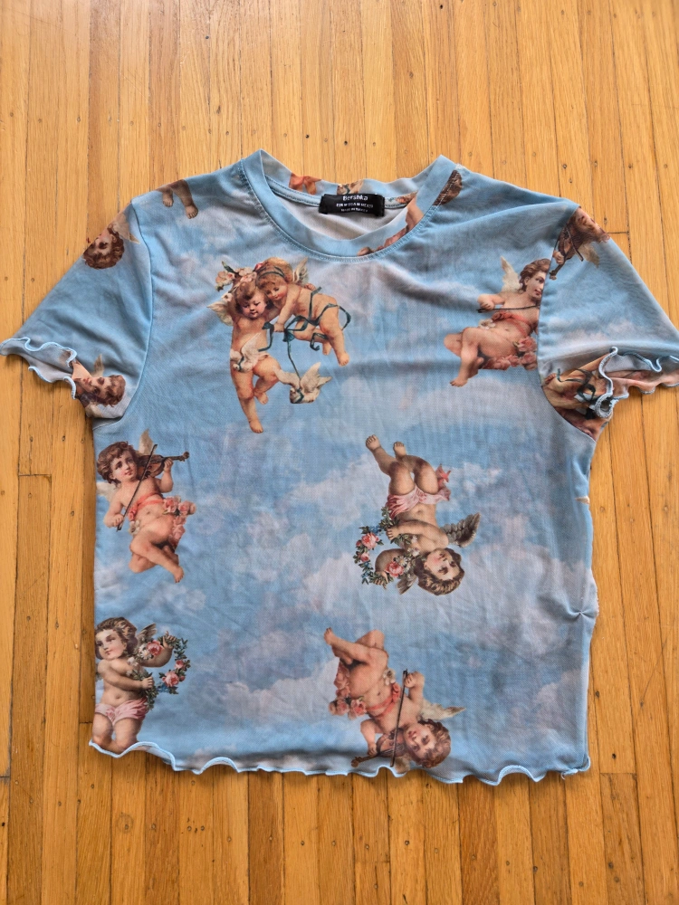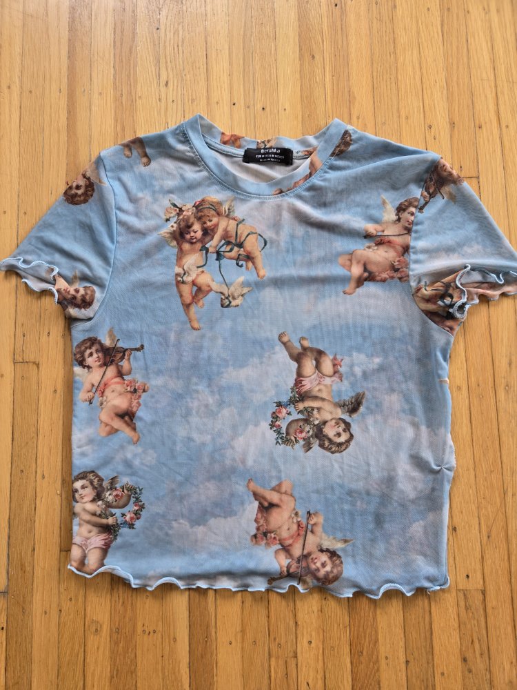 Selling a cute Bershka mesh top with an all-over angel print! It's a size M. There is a small tear on the side, as shown in the photos. Easily repaired :)