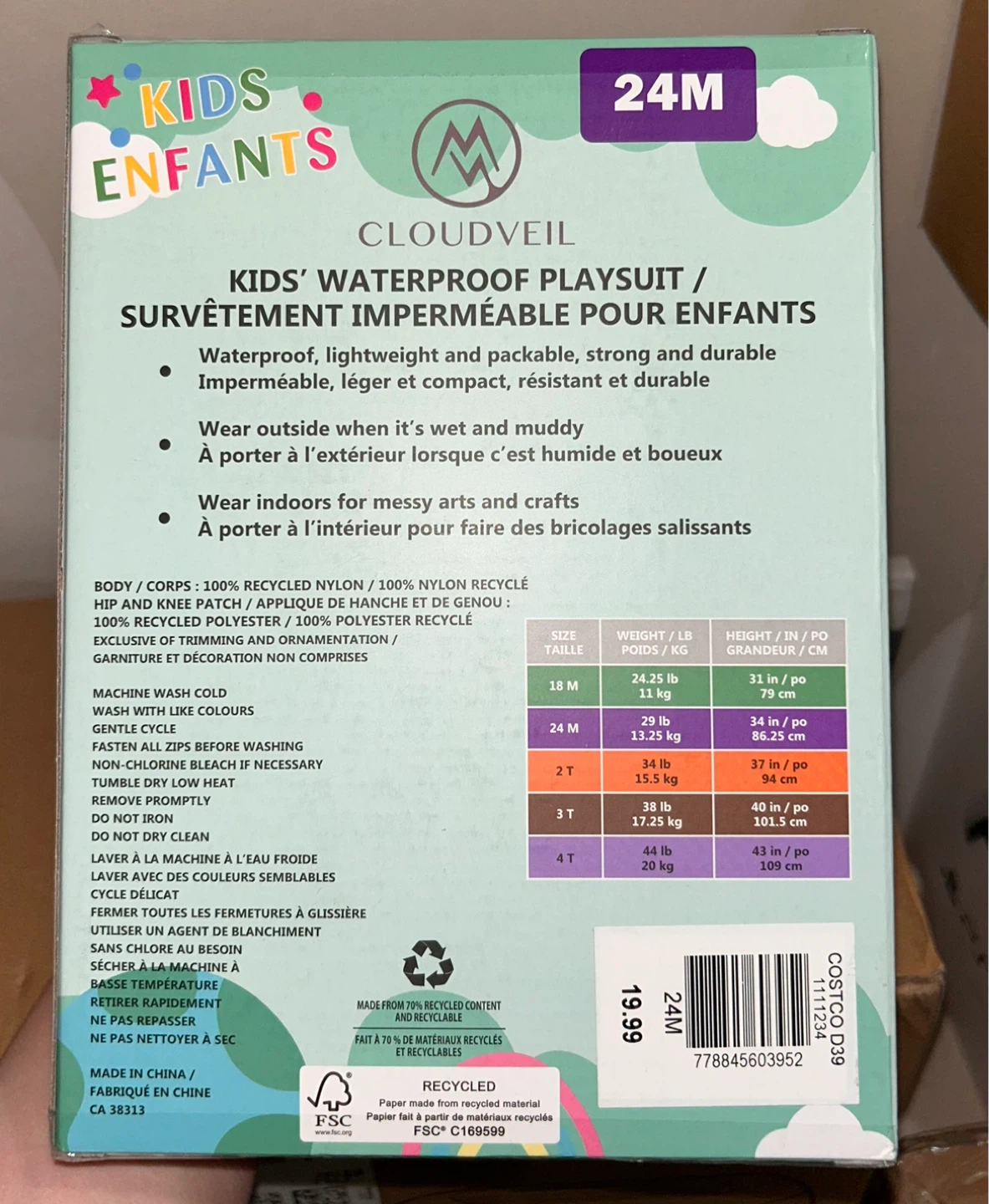 Cloudveil Kids' Waterproof Playsuit - 24M