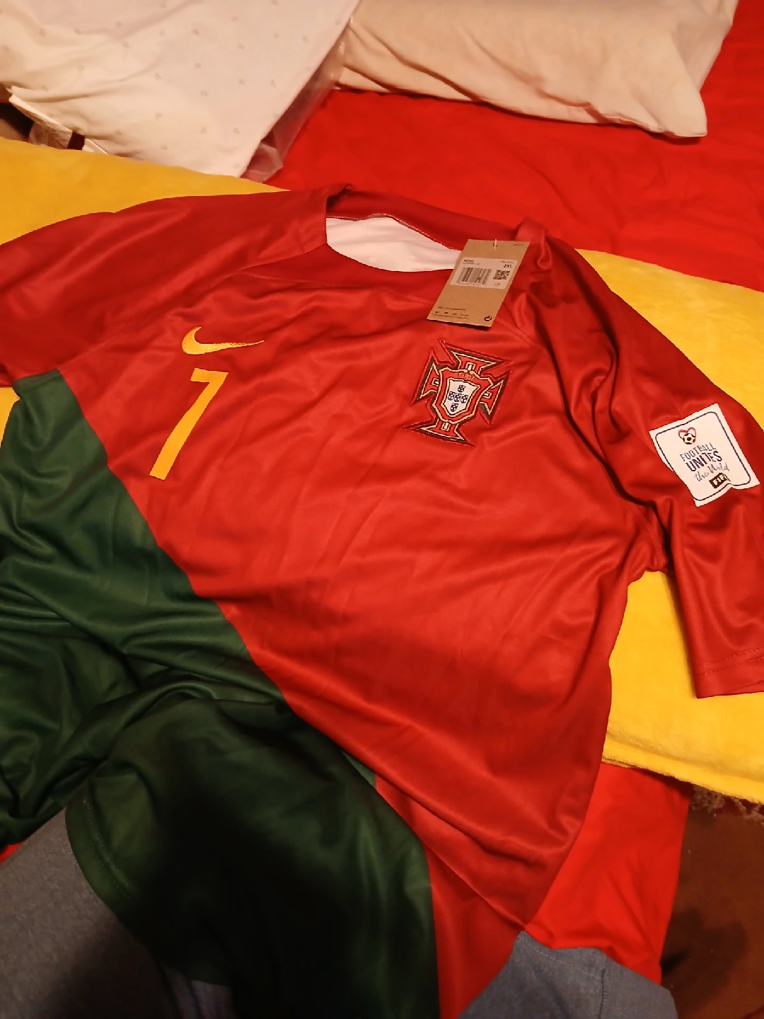Selling a Nike Portugal Ronaldo #7 soccer jersey kit, includes the shirt, shorts, and socks. The kit is red and green with gold accents. The jersey has the Portugal crest and Ronaldo's name and number on the back. The shorts are green with the Portugal crest and a Nike logo. The socks are red and green.