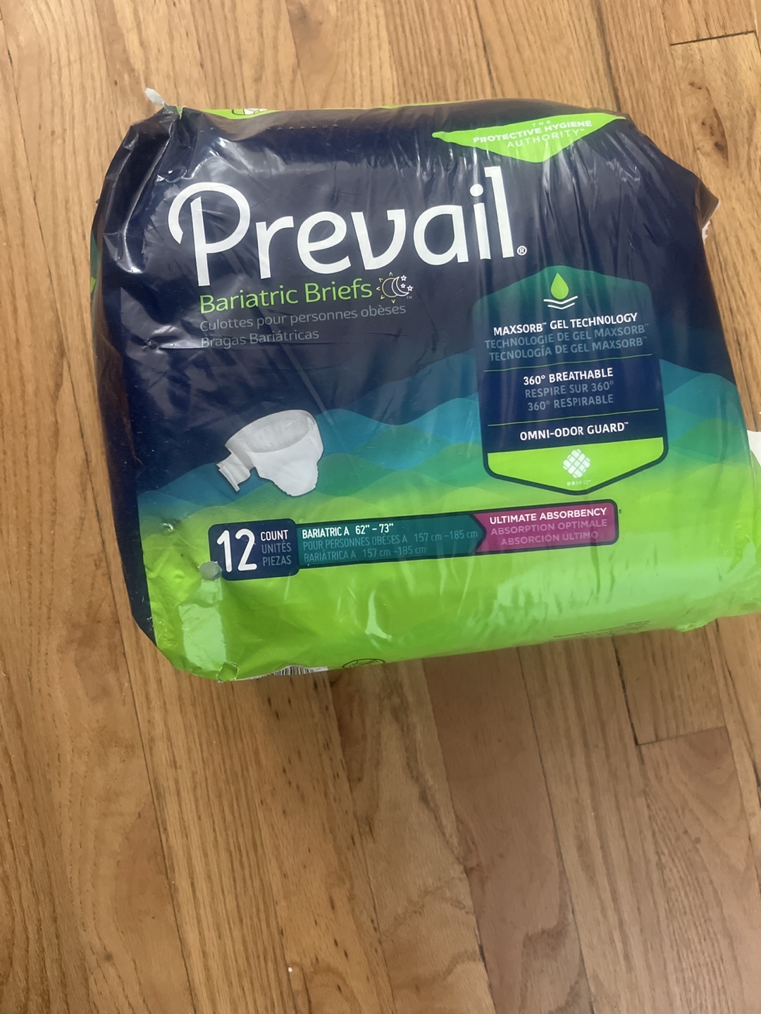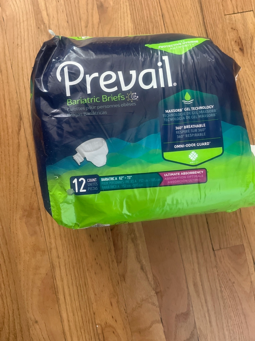 Selling a pack of Prevail Bariatric Briefs, designed for individuals needing sizes 62"-73" (157 cm-185 cm). They feature MaxSorb gel technology for ultimate absorbency, 360° breathability, and Omni-Odor Guard for comfort and protection
