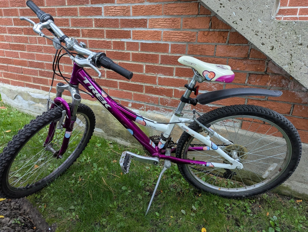 Selling a Trek MT220 kids' mountain bike in purple and white. It's a sturdy and reliable bike perfect for young riders who are just getting into mountain biking. Great for trails or just riding around the neighbourhood. The brakes and tires work great.