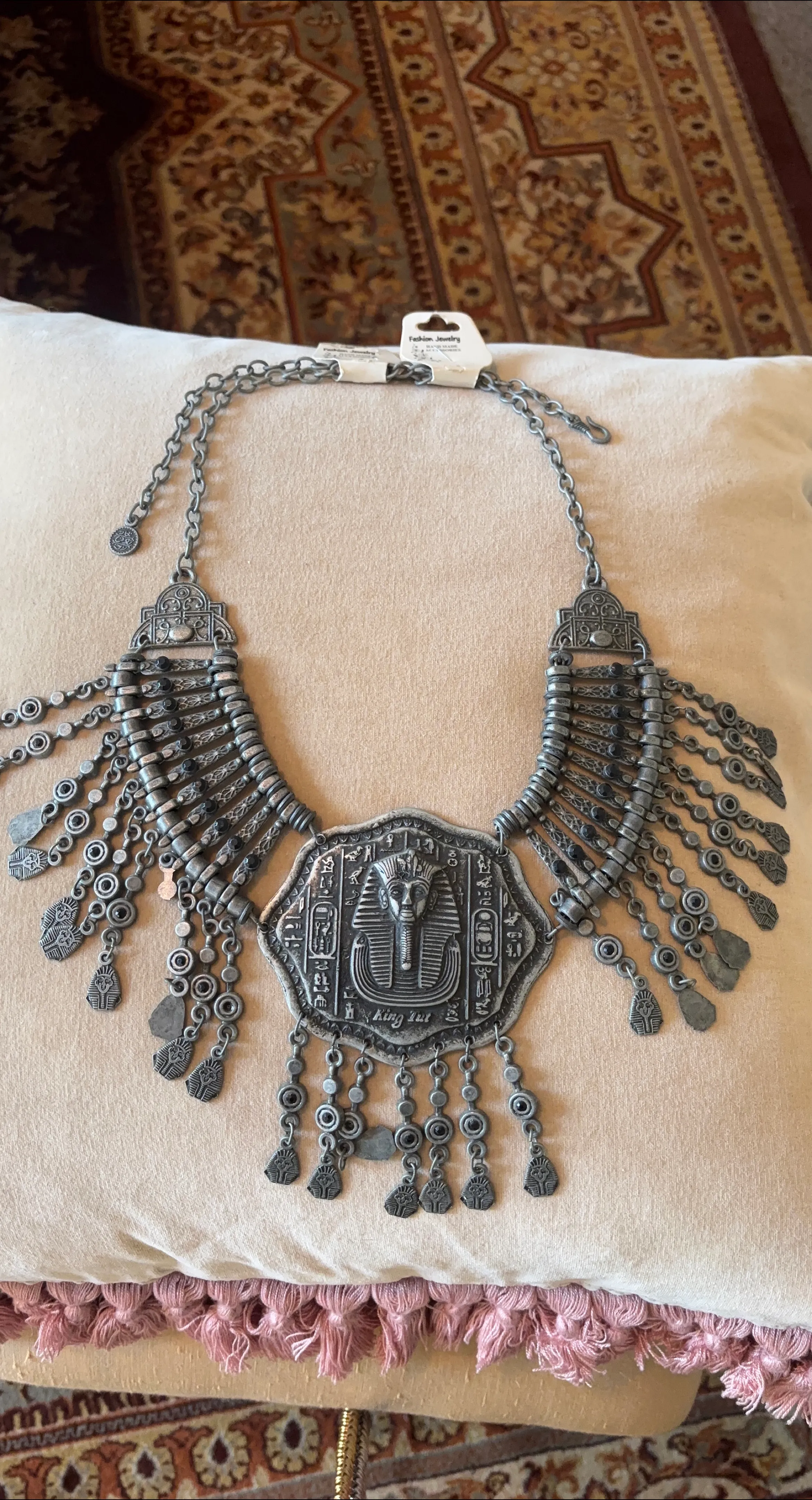 This is a Fashion Jewelry necklace featuring a King Tut design. It's a unique piece with a lot of detail, perfect for adding a statement to any outfit