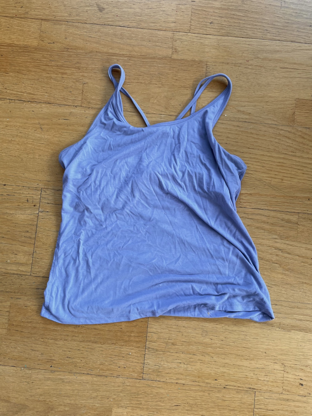Soft / comfortable material, cool criss cross patterning on the back. Has built in sports bra.