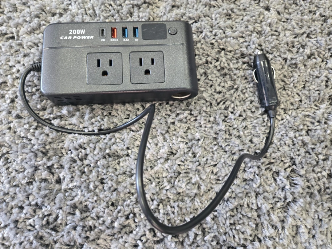 Selling a 200W car power inverter. It features multiple USB ports (PD, QC3.0, 2.4A, and 1A) and two standard AC outlets. Perfect for charging devices on the go!