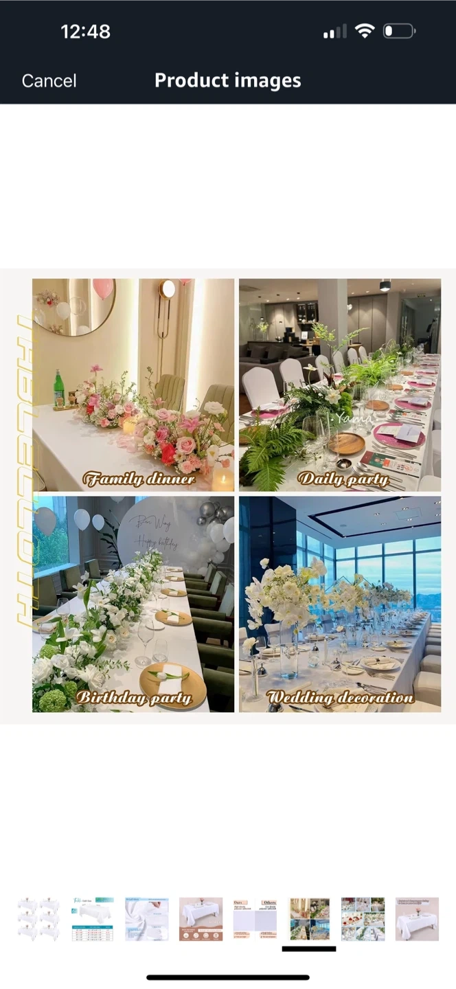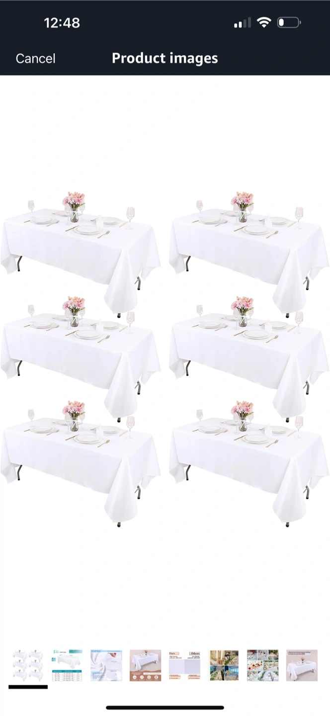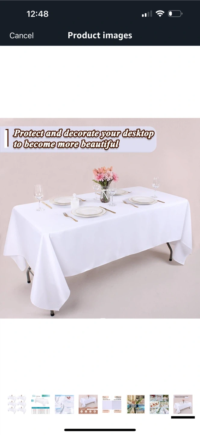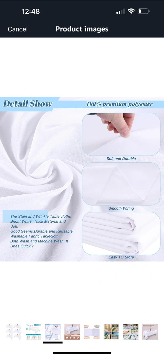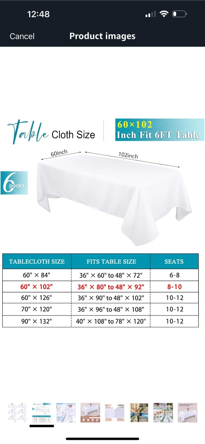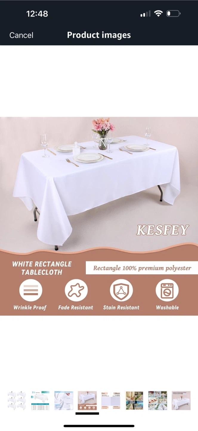 This KESFEY white rectangle tablecloth is perfect for a 6FT table. It measures 60 x 102 inches and comfortably seats 8-10 people. Made from 100% premium polyester, it's wrinkle-proof, fade-resistant, stain-resistant, and machine washable! It's soft, durable, and easy to store