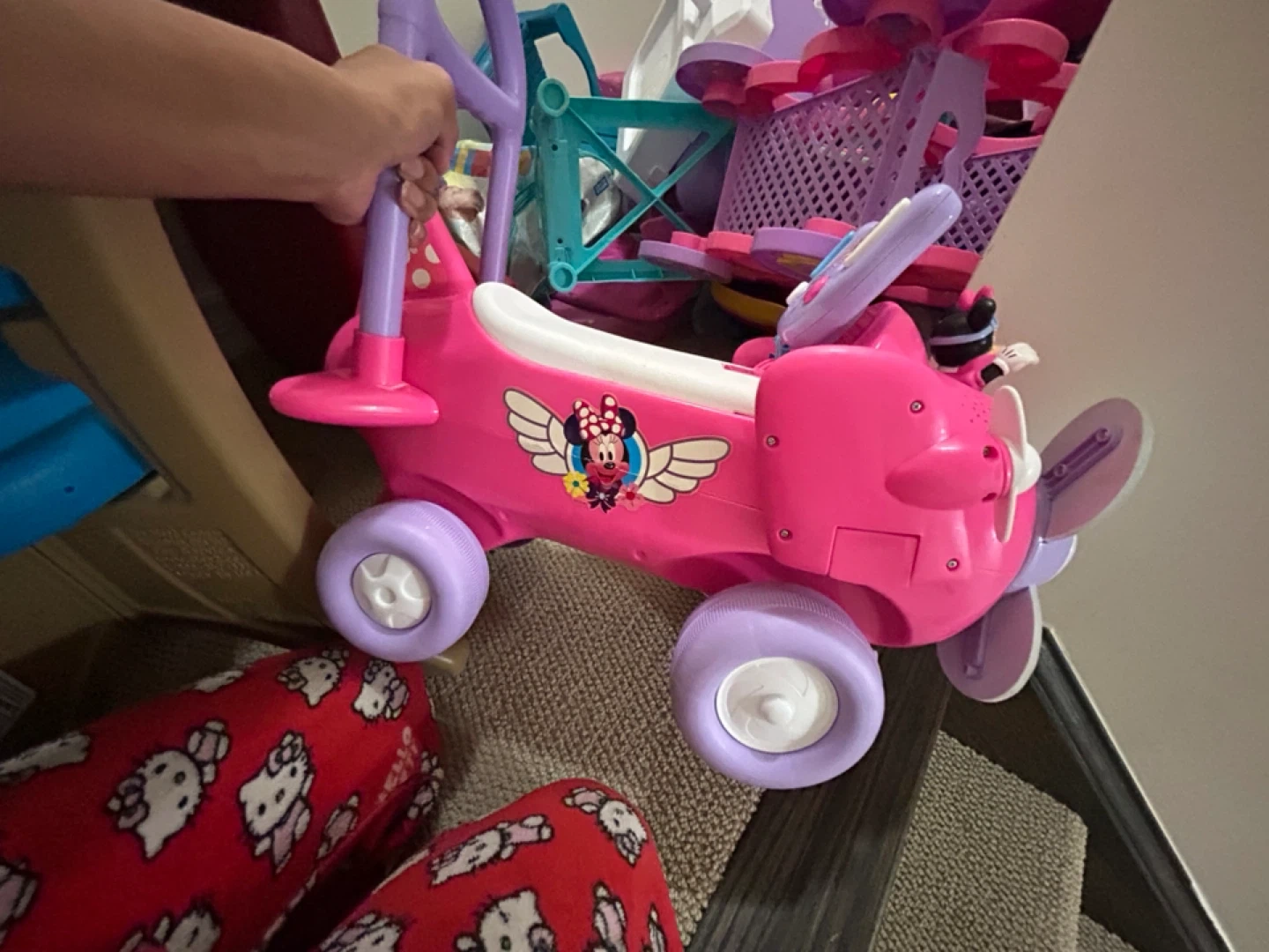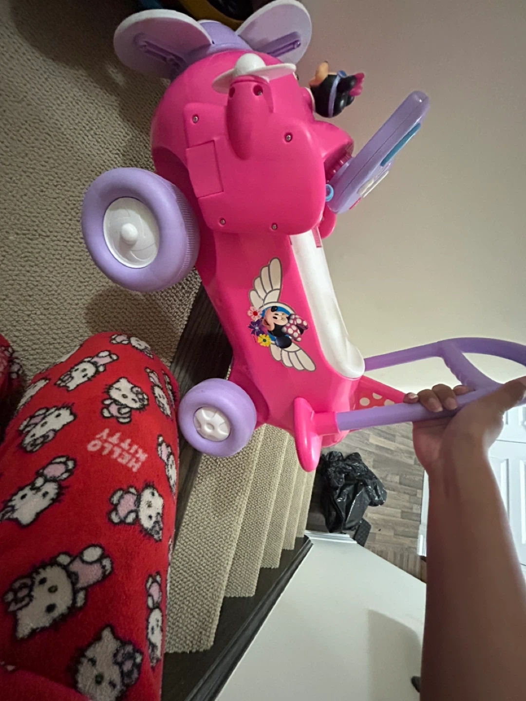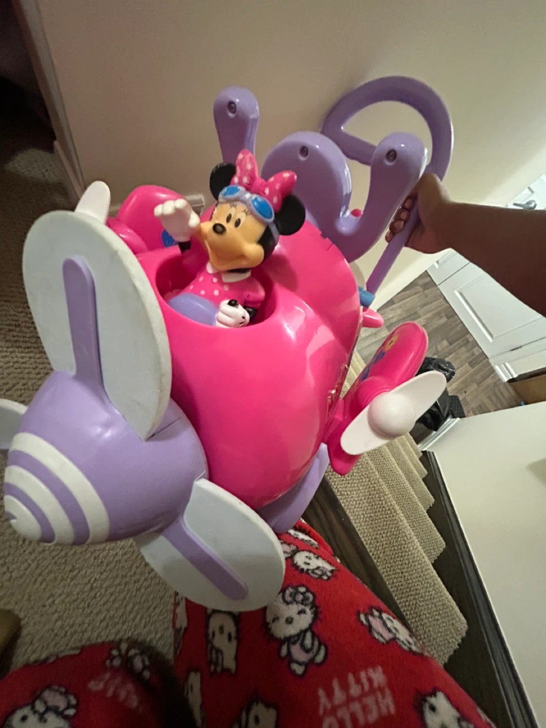 Selling a cute Minnie Mouse ride-on airplane! It's pink and purple and perfect for a little one who loves Minnie Mouse. Great for indoor or outdoor play. Hours of fun to be had!