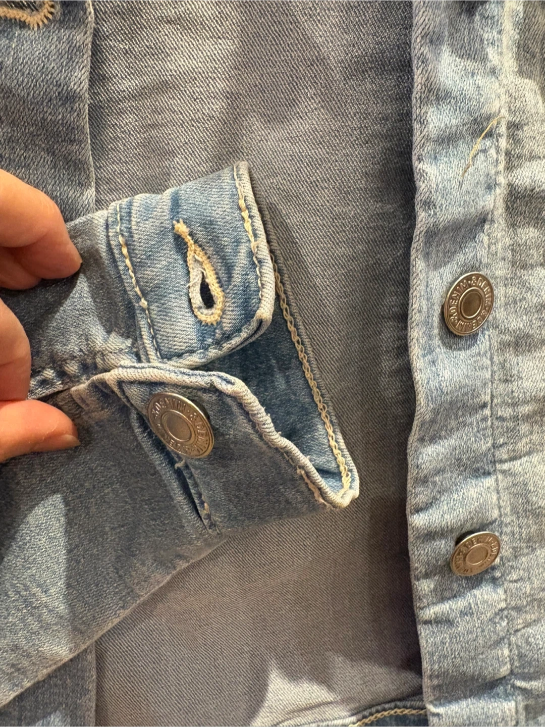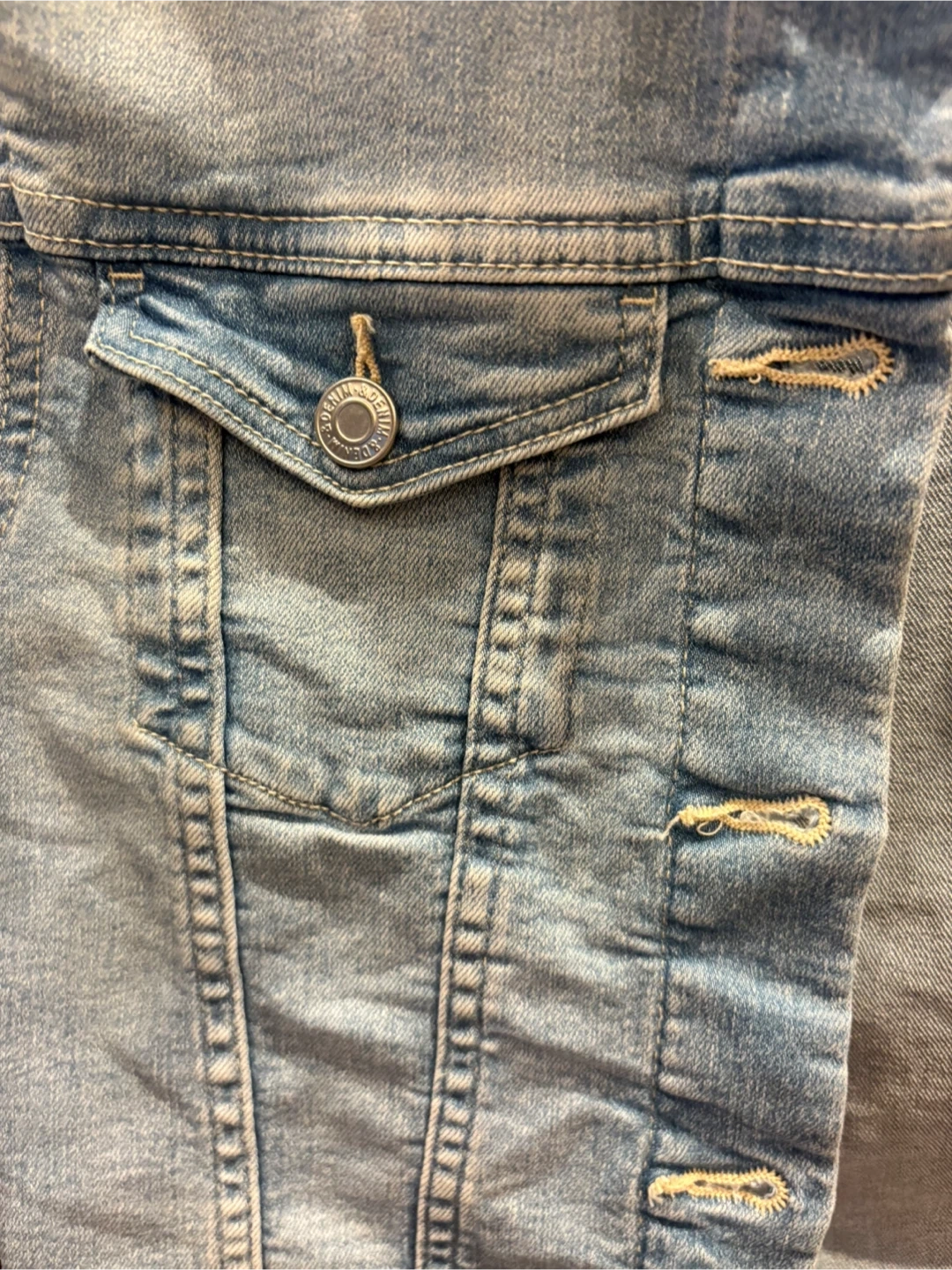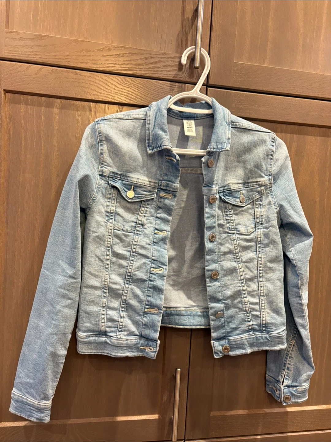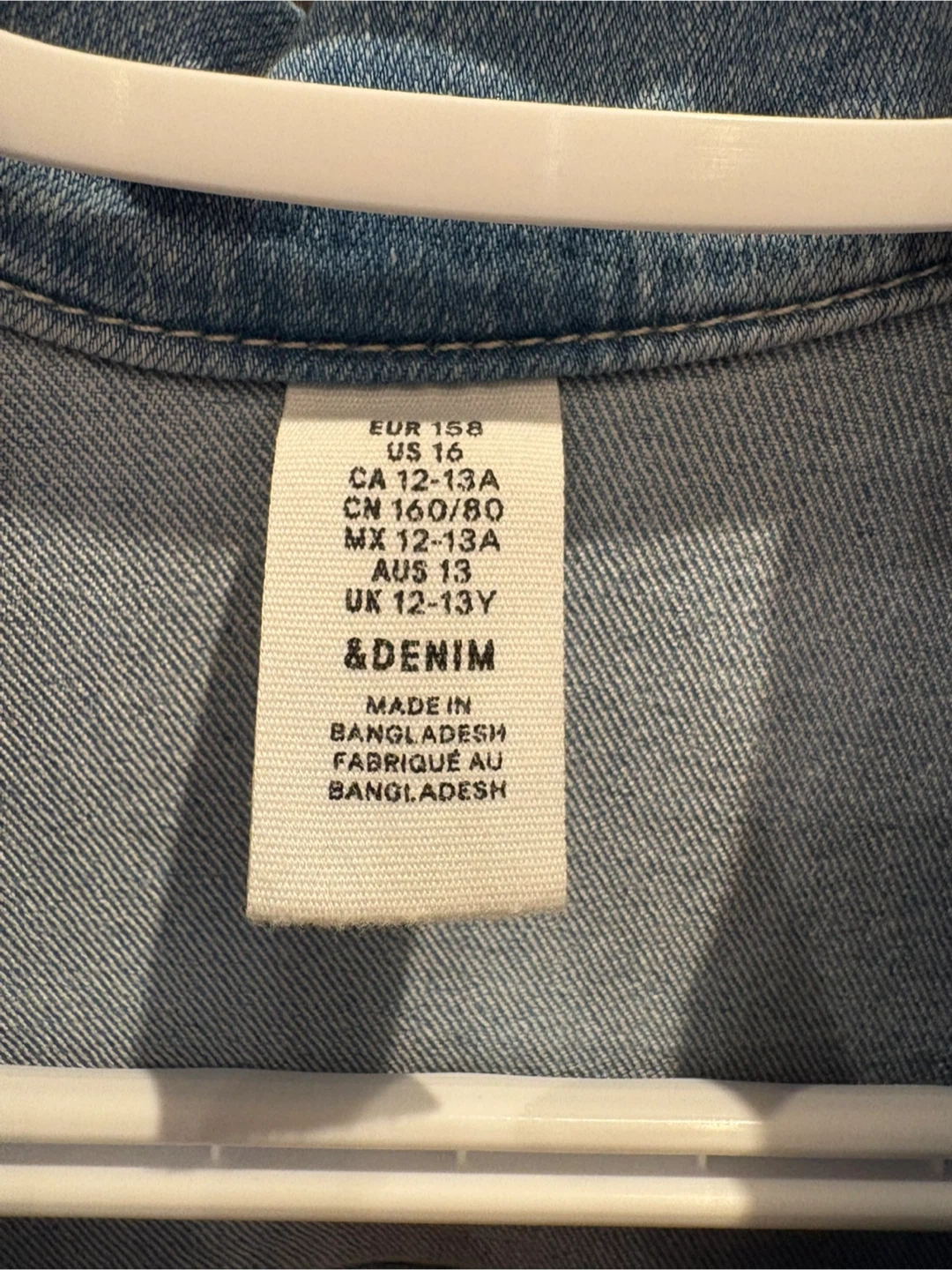 Selling a H&M denim jacket in size 12-13A. It's in great condition and perfect for layering! The jacket is made of denim and has a classic light wash. It's a great addition to any wardrobe