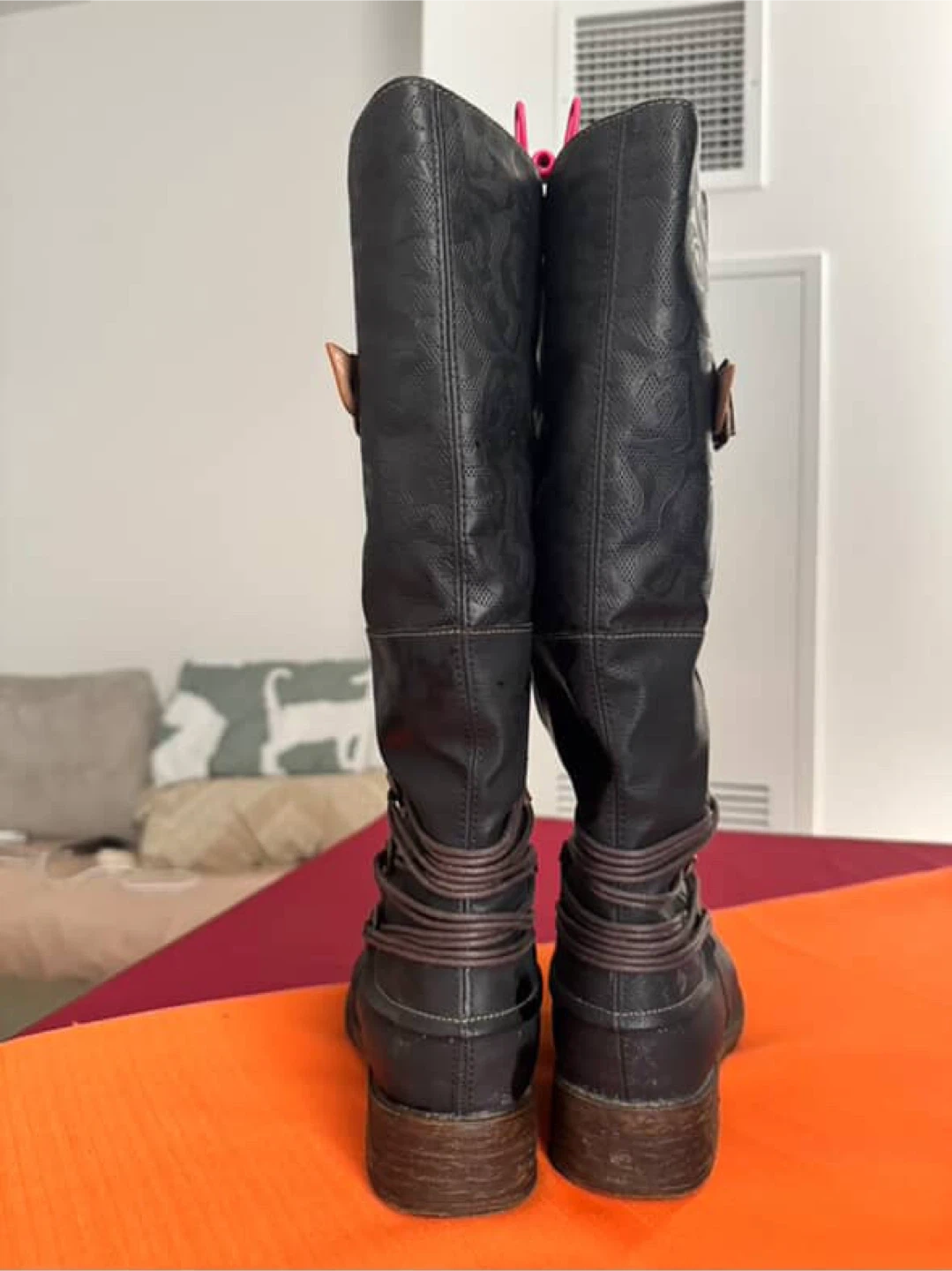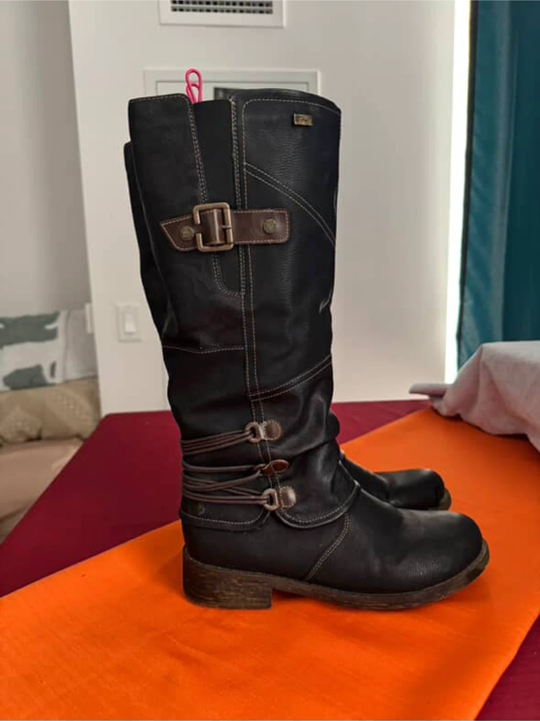 Selling a pair of black boots. The boots are lined with a soft, warm material, perfect for colder weather. They show some signs of wear but are still in great condition. Size 38/7.5