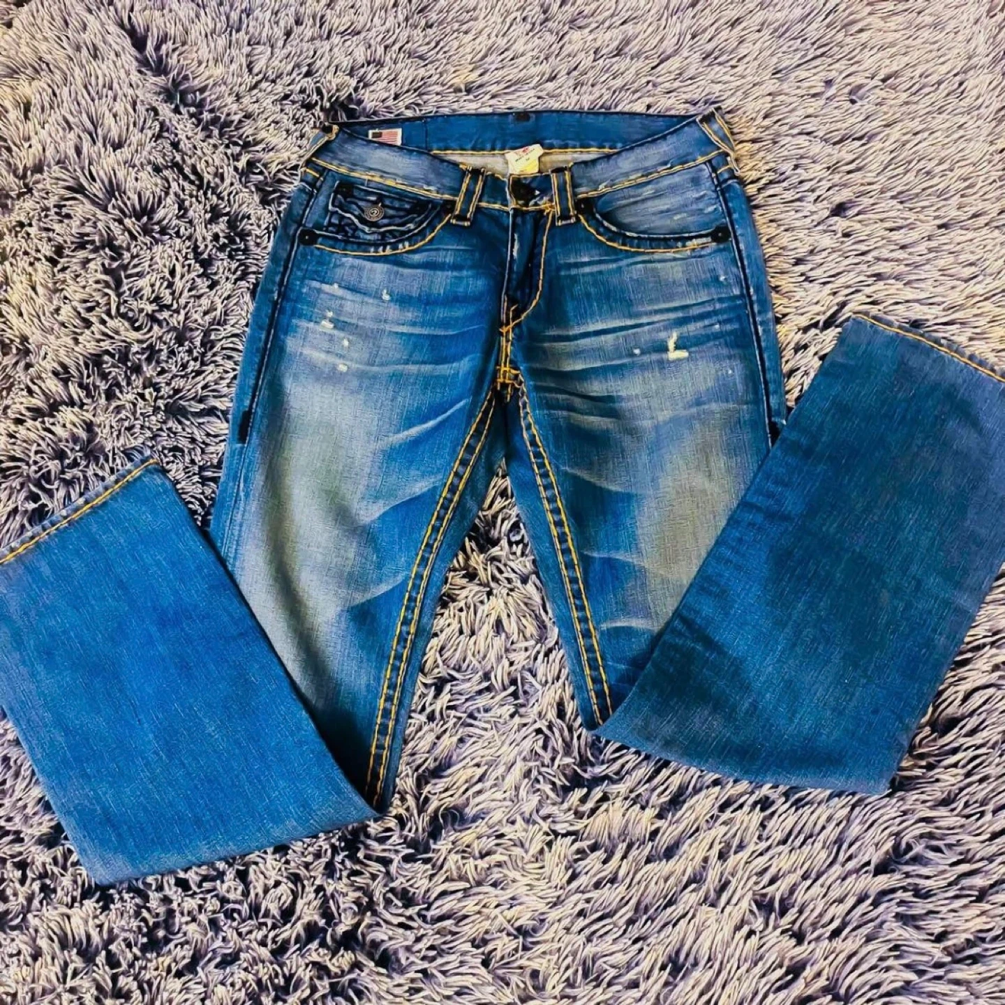 Selling a pair of True Religion jeans in size 32. They have a stylish design with unique pocket detailing and signature stitching. These jeans are made in the USA and have a comfortable fit. Perfect for adding a touch of edgy style to your wardrobe!