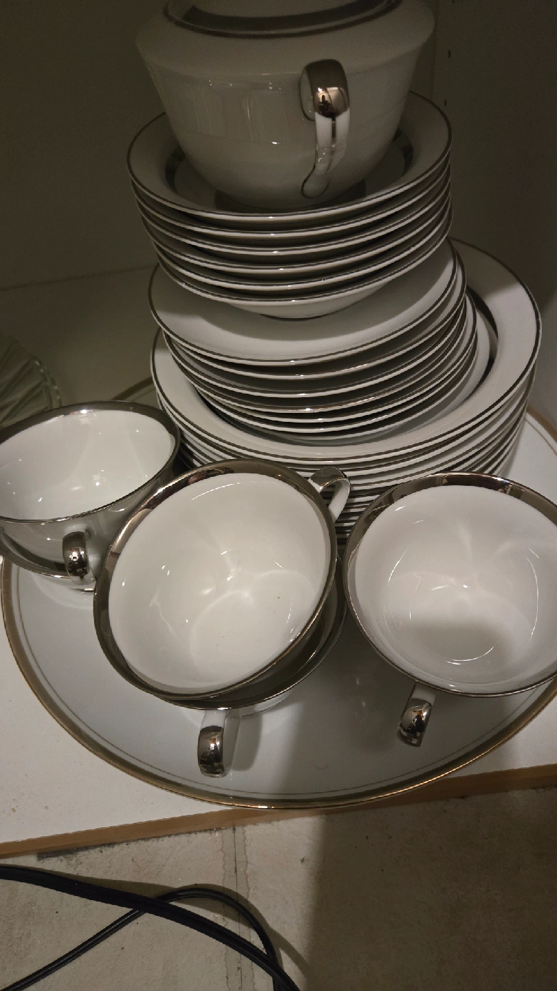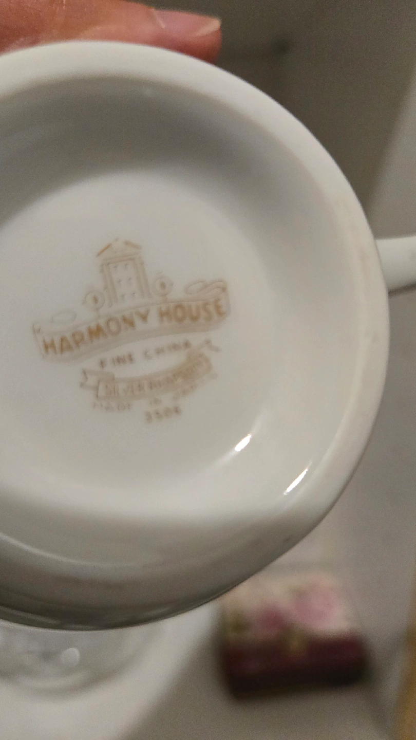 21Selling a Harmony House fine china set. It includes plates, cups, ..etc The set features a silver trim.