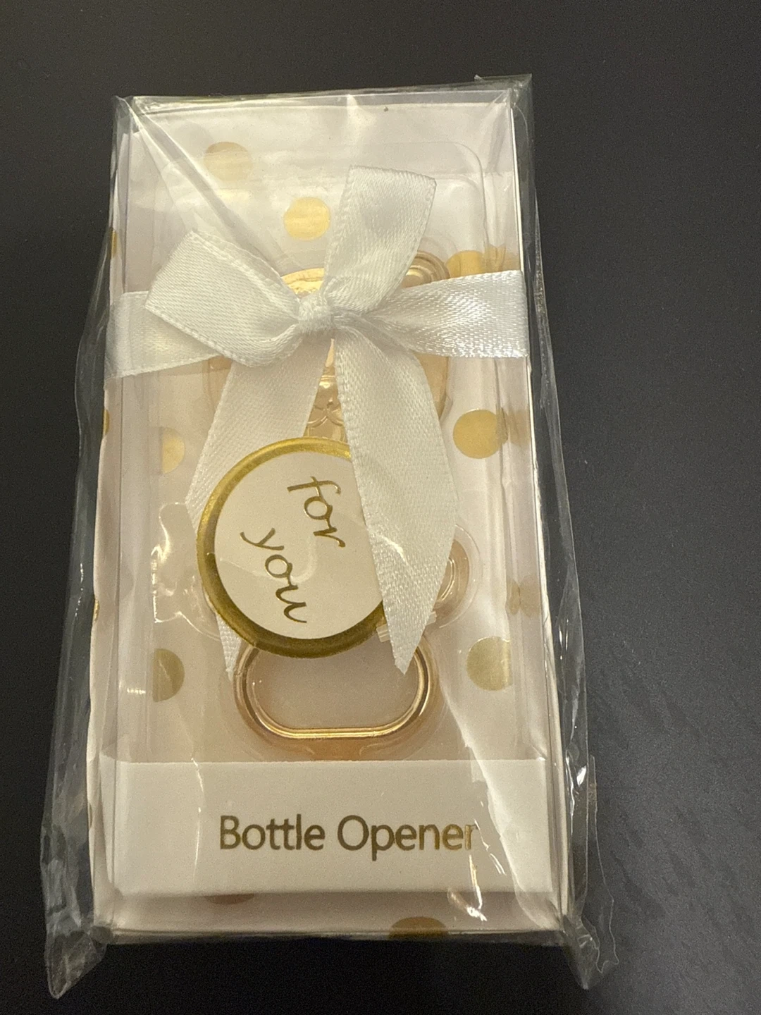 I have a new bottle opener still in its original packaging. It has a gold finish and a cute little "for you" tag. Perfect for parties or as a small gift!