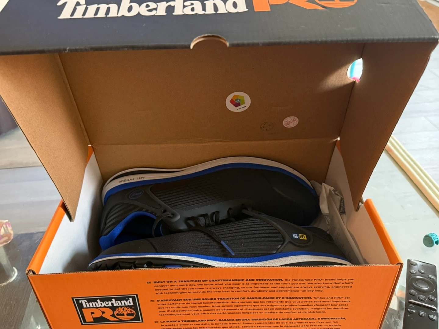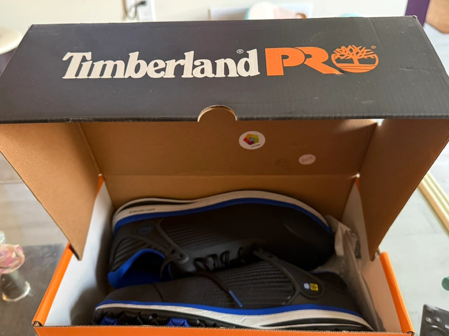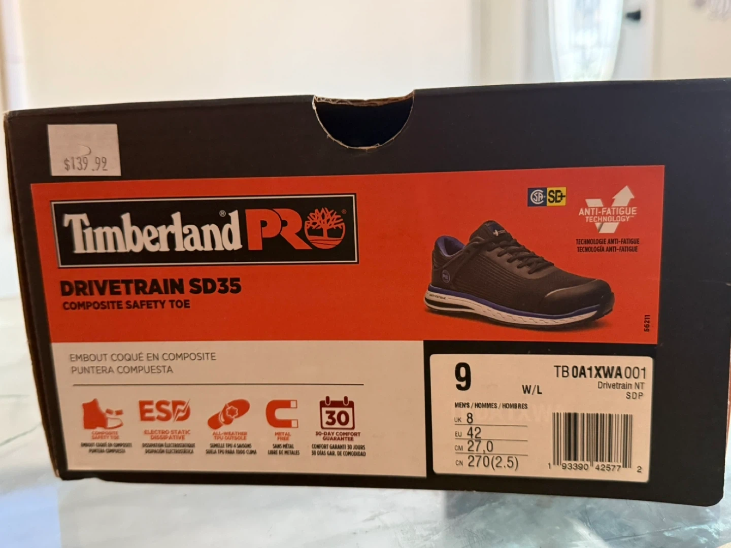 Selling a pair of Timberland PRO Drivetrain SD35 composite toe work shoes in size 9. They are in great condition and come with the original box. The box shows that they were originally bought for $139.99. These shoes are designed with anti-fatigue technology and have an electro static dissipative (ESD) feature for safety. They are oil and slip resistant too!