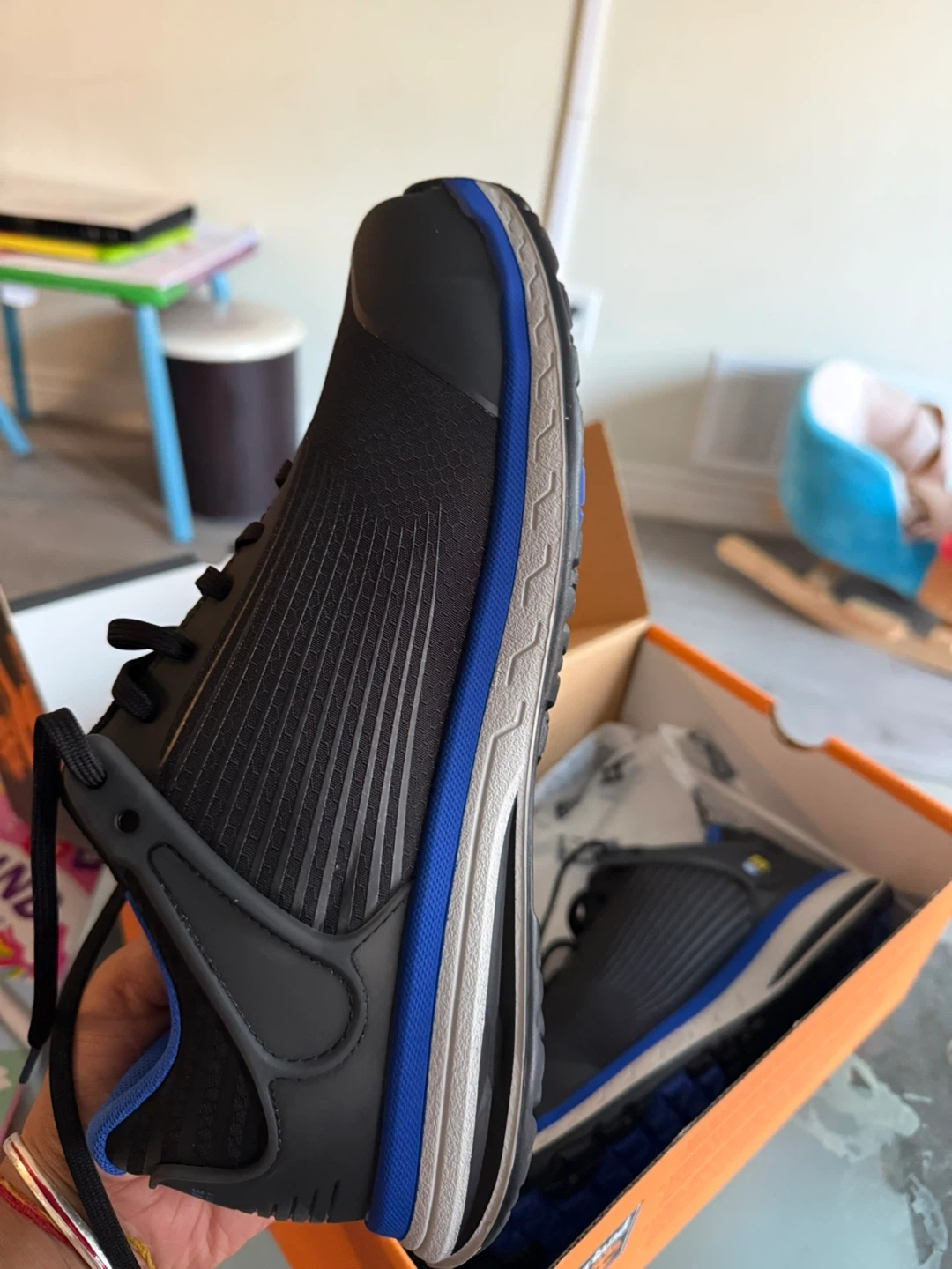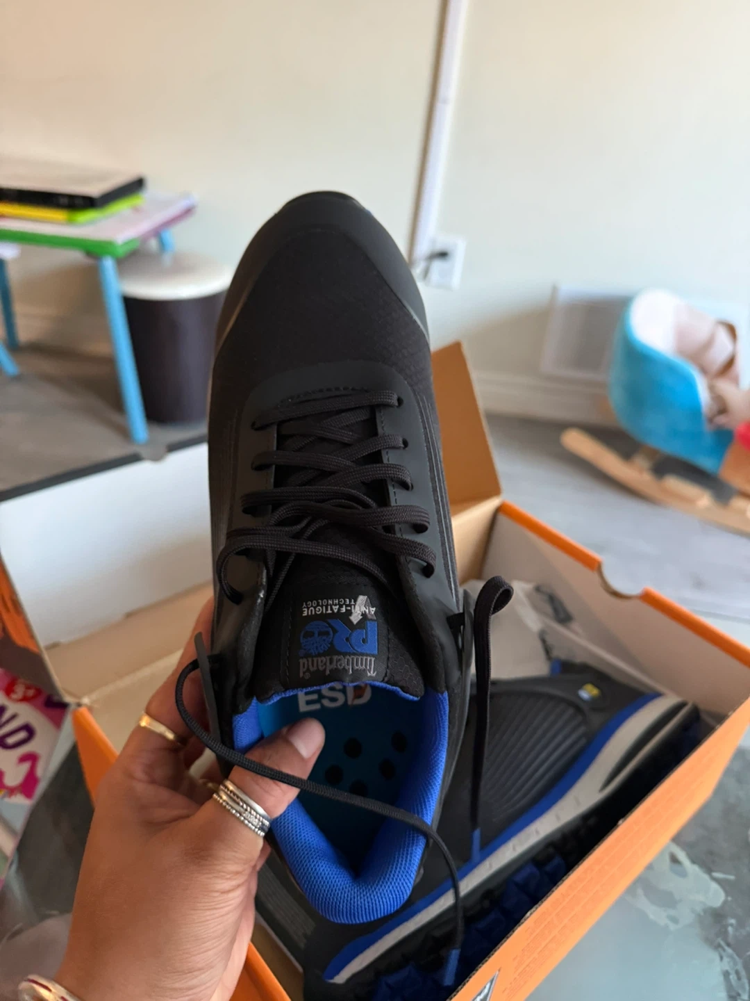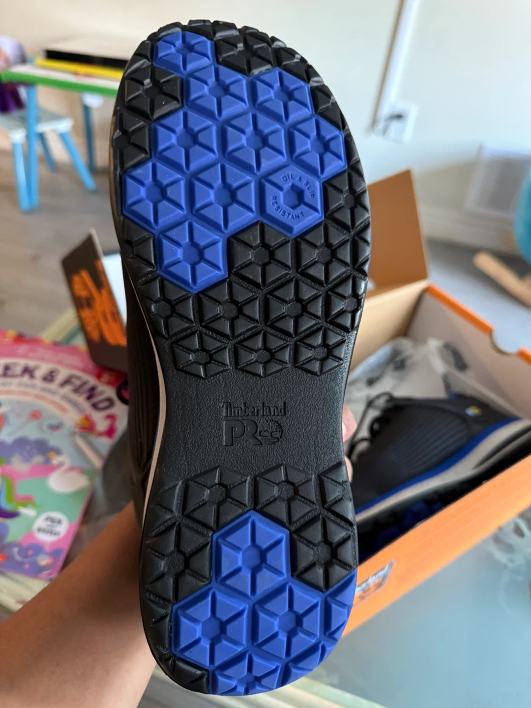 Selling a pair of Timberland PRO Drivetrain SD35 composite toe work shoes in size 9. They are in great condition and come with the original box. The box shows that they were originally bought for $139.99. These shoes are designed with anti-fatigue technology and have an electro static dissipative (ESD) feature for safety. They are oil and slip resistant too!