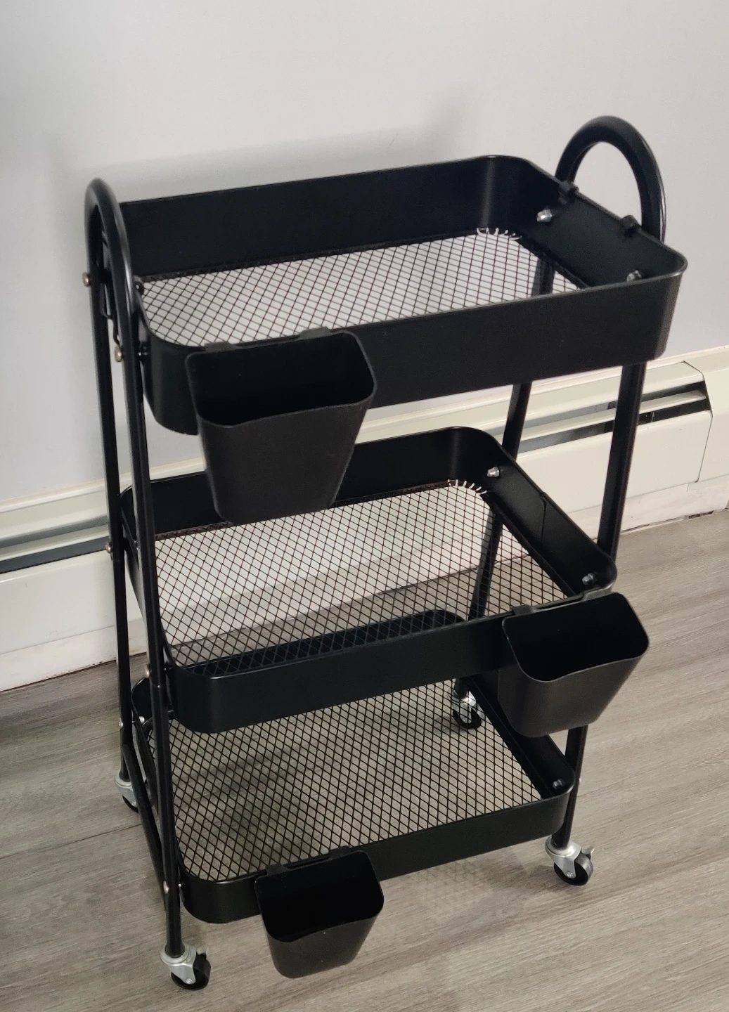 This is a versatile 3-tier rolling storage cart in black. It includes several detachable bins for extra organization. The cart's mesh shelves and wheels make it easy to move around your space. It's great for craft supplies, kitchen items, or bathroom essentials!